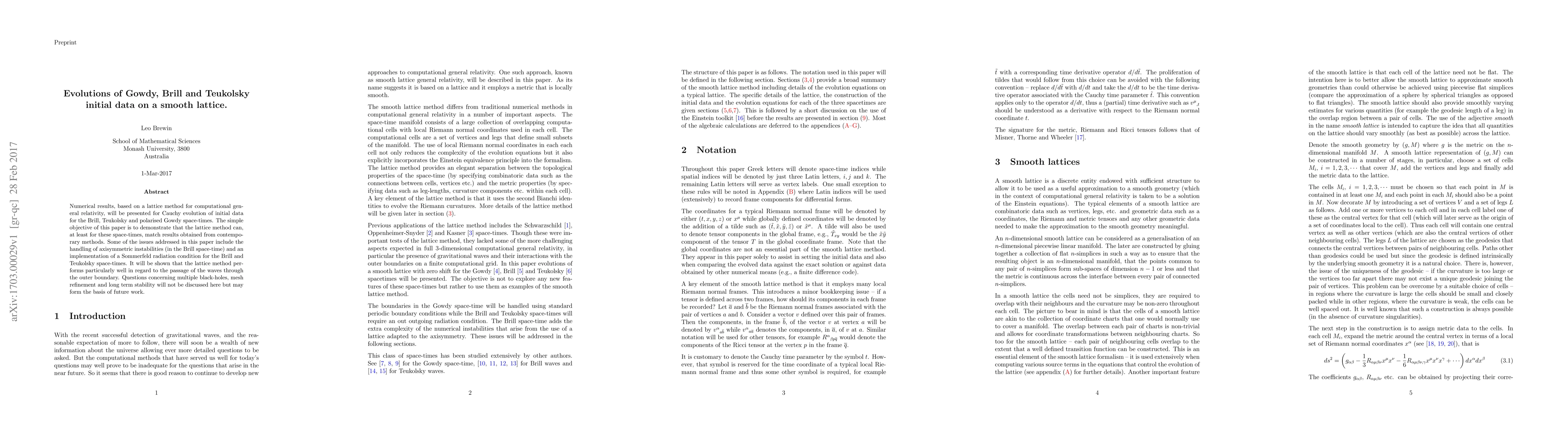 Numerical results, based on a lattice method for computational general relativity, will be presented for Cauchy evolution of initial data for the Brill, Teukolsky and polarised Gowdy space-times. The simple objective of this paper is to demonstrate that the lattice method can, at least for these space-times, match results obtained from contemporary methods. Some of the issues addressed in this paper include the handling of axisymmetric instabilities (in the Brill space-time) and an implementation of a Sommerfeld radiation condition for the Brill and Teukolsky space-times. It will be shown that the lattice method performs particularly well in regard to the passage of the waves through the outer boundary. Questions concerning multiple black-holes, mesh refinement and long term stability will not be discussed here but may form the basis of future work.