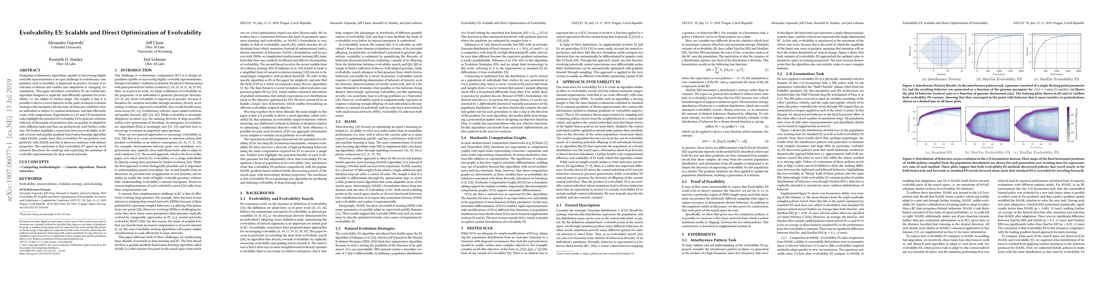 This paper introduces evolvability ES, an evolutionary algorithm that optimizes for evolvability to accelerate adaptation in changing environments. Experiments show it can efficiently generate highly evolvable solutions, performing competitively with MAML while discovering distinct solutions.