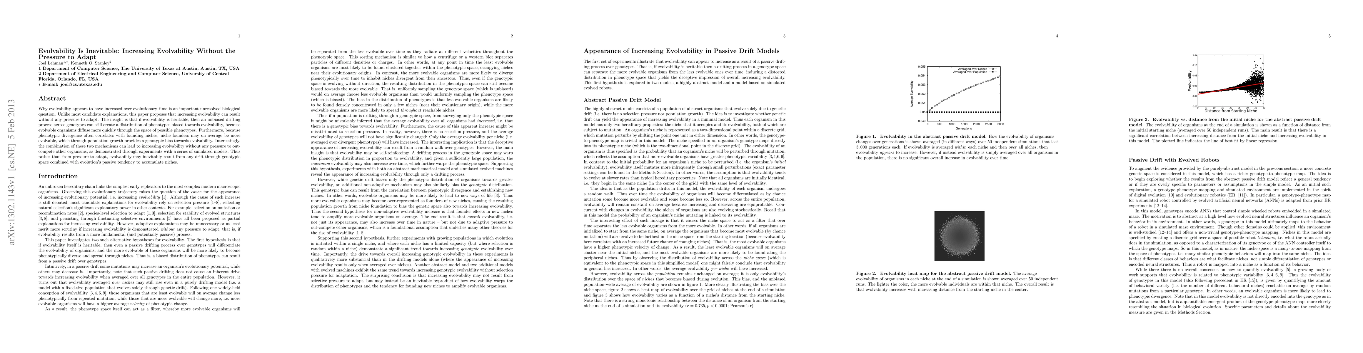 This paper argues that increasing evolvability can occur without the need for adaptive pressure. It suggests that heritable evolvability can arise through unbiased genetic drift and niche founding, leading to a population bias towards evolvability.