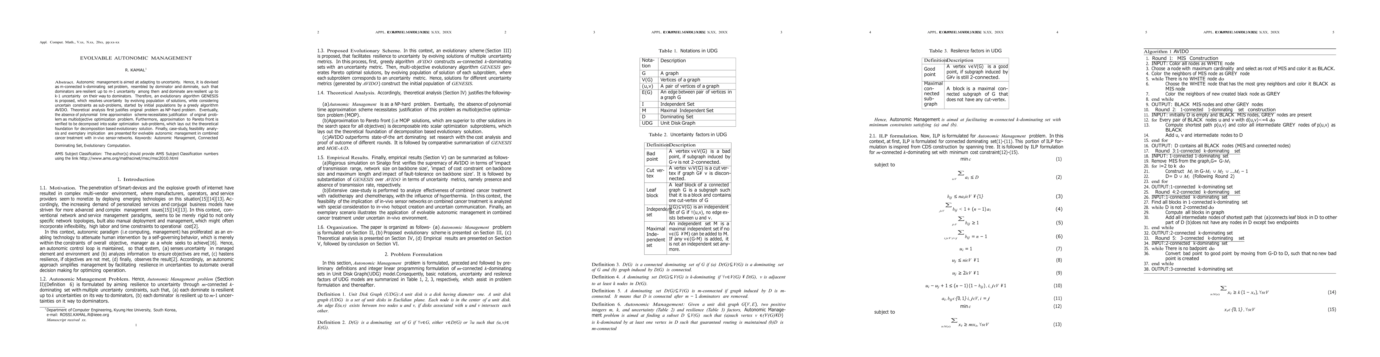 Autonomic management is aimed at adapting to uncertainty. Hence, it is devised as m-connected k-dominating set problem, resembled by dominator and dominate, such that dominators are resilient up to m-1 uncertainty among them and dominate are resilient up to k-1 uncertainty on their way to dominators. Therefore, an evolutionary algorithm GENESIS is proposed, which resolves uncertainty by evolving population of solutions, while considering uncertain constraints as sub-problems, started by initial populations by a greedy algorithm AVIDO. Theoretical analysis first justifies original problem as NP-hard problem. Eventually, the absence of polynomial time approximation scheme necessitates justification of original problem as multiobjective optimization problem. Furthermore, approximation to Pareto front is verified to be decomposed into scalar optimization sub-problems, which lays out the theoretical foundation for decomposition based evolutionary solution. Finally, case-study, feasibility analysis and exemplary implication are presented for evolvable autonomic management in combined cancer treatment with in-vivo sensor networks.