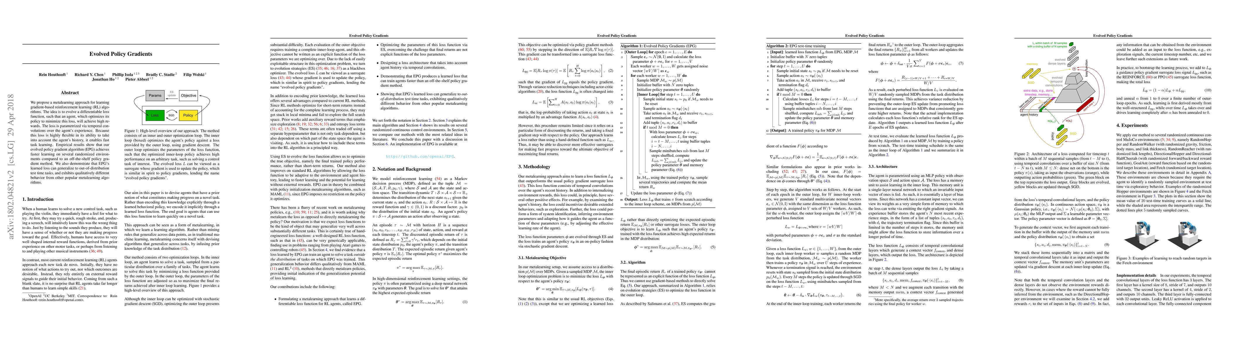 A new metalearning approach called Evolved Policy Gradients (EPG) enables faster learning in reinforcement learning algorithms by evolving a differentiable loss function that considers the agent's history. EPG achieves better performance than traditional methods on randomized environments and generalizes to out-of-distribution tasks.
