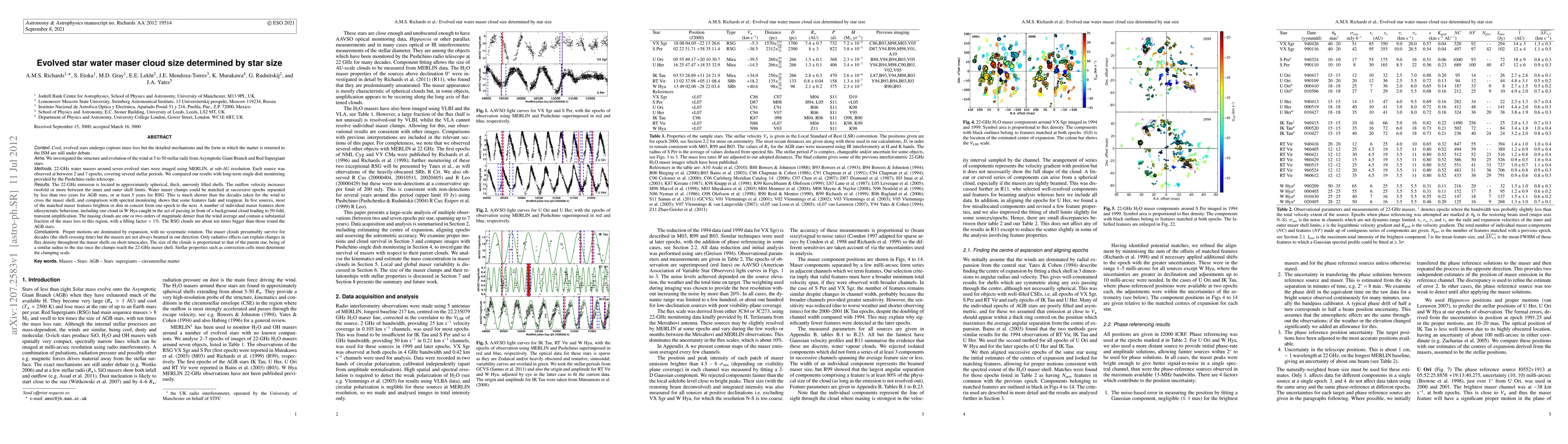 Cool, evolved stars undergo copious mass loss but the details of how the matter is returned to the ISM are still under debate. We investigated the structure and evolution of the wind at 5 to 50 stellar radii from Asymptotic Giant Branch and Red Supergiant stars. 22-GHz water masers around seven evolved stars were imaged using MERLIN, at sub-AU resolution. Each source was observed at between 2 and 7 epochs (several stellar periods). We compared our results with long-term Pushchino single dish monitoring. The 22-GHz emission is located in ~spherical, thick, unevenly filled shells. The outflow velocity doubles between the inner and outer shell limits. Water maser clumps could be matched at successive epochs separated by <2 years for AGB stars, or at least 5 years for RSG. This is much shorter than the decades taken for the wind to cross the maser shell, and comparison with spectral monitoring shows that some features fade and reappear. In 5 sources, most of the matched features brighten or dim in concert from one epoch to the next. One cloud in W Hya was caught in the act of passing in front of a background cloud leading to 50-fold, transient amplification. The masing clouds are 1-2 orders of magnitude denser than the wind average and contain a substantial fraction of the mass loss in this region, with a filling factor <1%. The RSG clouds are ~10x bigger than those round the AGB stars. Proper motions are dominated by expansion, with no systematic rotation. The maser clouds survive for decades (the shell crossing time) but the masers are not always beamed in our direction. Radiative effects cause changes in flux density throughout the maser shells on short timescales. Cloud size is proportional to parent star size; clouds have a similar radius to the star in the 22-GHz maser shell. Stellar properties such as convection cells must determine the clumping scale.
