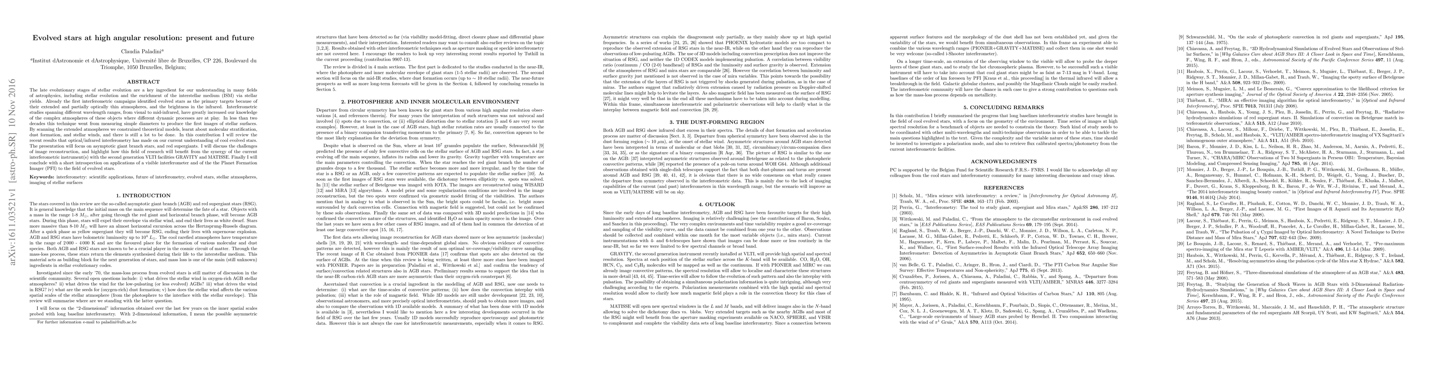 The late evolutionary stages of stellar evolution are a key ingredient for our understanding in many fields of astrophysics, including stellar evolution and the enrichment of the interstellar medium (ISM) via stellar yields. Already the first interferometric campaigns identified evolved stars as the primary targets because of their extended and partially optically thin atmospheres, and the brightness in the infrared. Interferometric studies spanning different wavelength ranges, from visual to mid-infrared, have greatly increased our knowledge of the complex atmospheres of these objects where different dynamic processes are at play. In less than two decades this technique went from measuring simple diameters to produce the first images of stellar surfaces. By scanning the extended atmospheres we constrained theoretical models, learnt about molecular stratification, dust formation, and stellar winds, and there is still a lot to be done. In this contribution I will review the recent results that optical/infrared interferometry has made on our current understanding of cool evolved stars. The presentation will focus on asymptotic giant branch stars, and red supergiants. I will discuss the challenges of image reconstruction, and highlight how this field of research will benefit from the synergy of the current interferometric instrument(s) with the second generation VLTI facilities GRAVITY and MATISSE. Finally I will conclude with a short introspection on applications of a visible interferometer and of the the Planet Formation Imager (PFI) to the field of evolved stars.