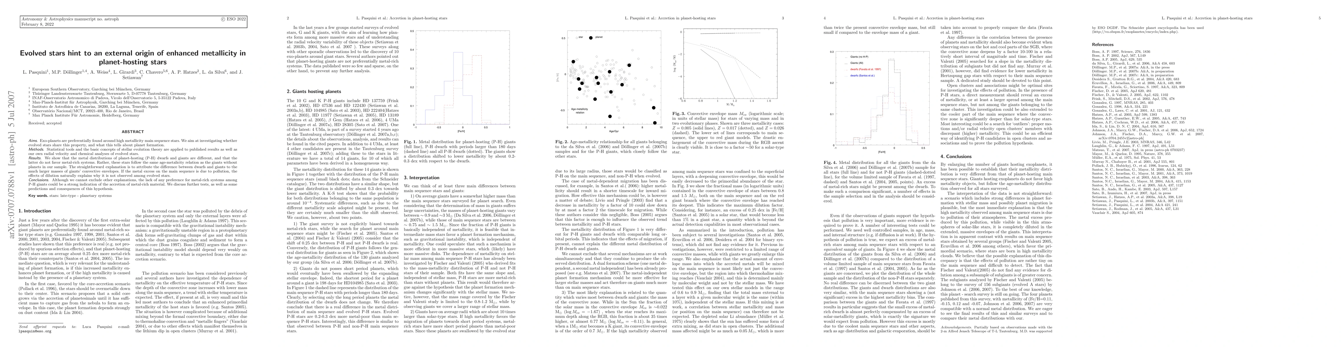 Exo-planets are preferentially found around high metallicity main sequence stars. We aim at investigating whether evolved stars share this property, and what this tells about planet formation. Statistical tools and the basic concepts of stellar evolution theory are applied to published results as well as our own radial velocity and chemical analyses of evolved stars. We show that the metal distributions of planet-hosting (P-H) dwarfs and giants are different, and that the latter do not favor metal-rich systems. Rather, these stars follow the same age-metallicity relation as the giants without planets in our sample. The straightforward explanation is to attribute the difference between dwarfs and giants to the much larger masses of giants' convective envelopes. If the metal excess on the main sequence is due to pollution, the effects of dilution naturally explains why it is not observed among evolved stars. Although we cannot exclude other explanations, the lack of any preference for metal-rich systems among P-H giants could be a strong indication of the accretion of metal-rich material. We discuss further tests, as well as some predictions and consequences of this hypothesis.