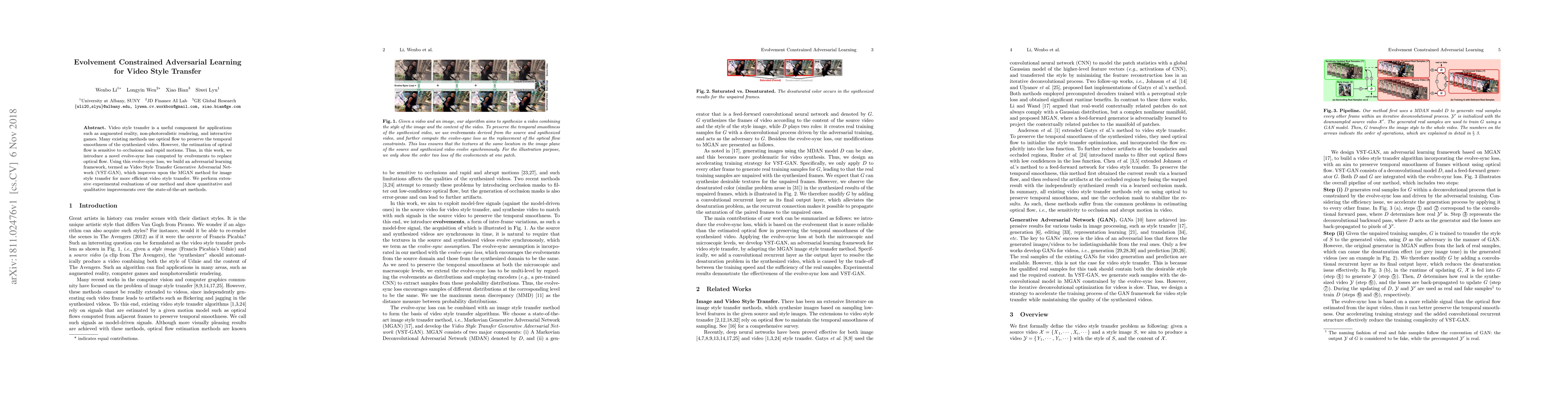 Video style transfer is a useful component for applications such as augmented reality, non-photorealistic rendering, and interactive games. Many existing methods use optical flow to preserve the temporal smoothness of the synthesized video. However, the estimation of optical flow is sensitive to occlusions and rapid motions. Thus, in this work, we introduce a novel evolve-sync loss computed by evolvements to replace optical flow. Using this evolve-sync loss, we build an adversarial learning framework, termed as Video Style Transfer Generative Adversarial Network (VST-GAN), which improves upon the MGAN method for image style transfer for more efficient video style transfer. We perform extensive experimental evaluations of our method and show quantitative and qualitative improvements over the state-of-the-art methods.