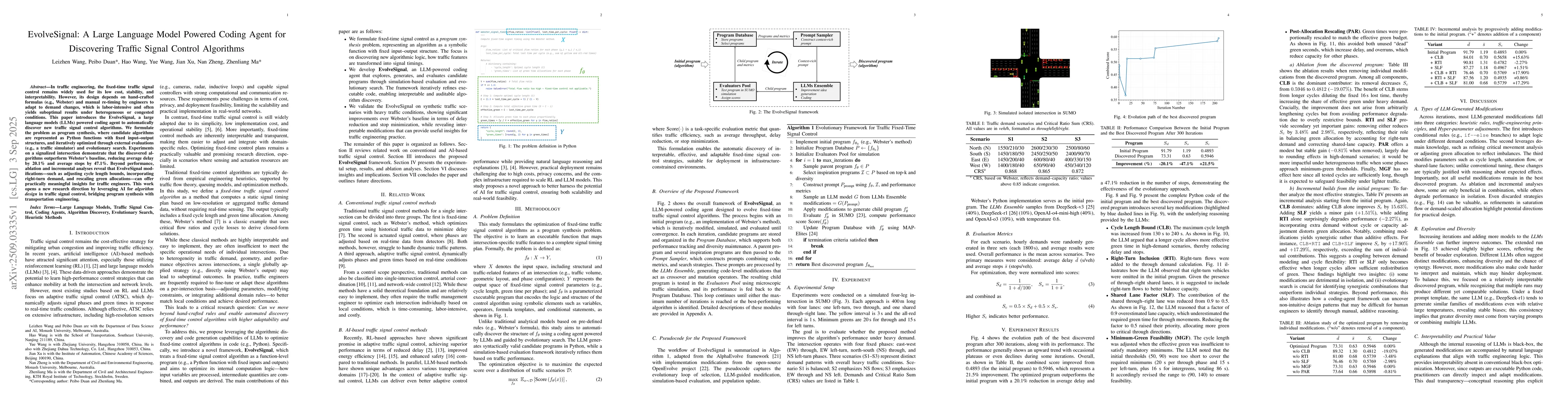 In traffic engineering, the fixed-time traffic signal control remains widely used for its low cost, stability, and interpretability. However, its design depends on hand-crafted formulas (e.g., Webster) and manual re-timing by engineers to adapt to demand changes, which is labor-intensive and often yields suboptimal results under heterogeneous or congested conditions. This paper introduces the EvolveSignal, a large language models (LLMs) powered coding agent to automatically discover new traffic signal control algorithms. We formulate the problem as program synthesis, where candidate algorithms are represented as Python functions with fixed input-output structures, and iteratively optimized through external evaluations (e.g., a traffic simulator) and evolutionary search. Experiments on a signalized intersection demonstrate that the discovered algorithms outperform Webster's baseline, reducing average delay by 20.1% and average stops by 47.1%. Beyond performance, ablation and incremental analyses reveal that EvolveSignal modifications-such as adjusting cycle length bounds, incorporating right-turn demand, and rescaling green allocations-can offer practically meaningful insights for traffic engineers. This work opens a new research direction by leveraging AI for algorithm design in traffic signal control, bridging program synthesis with transportation engineering.