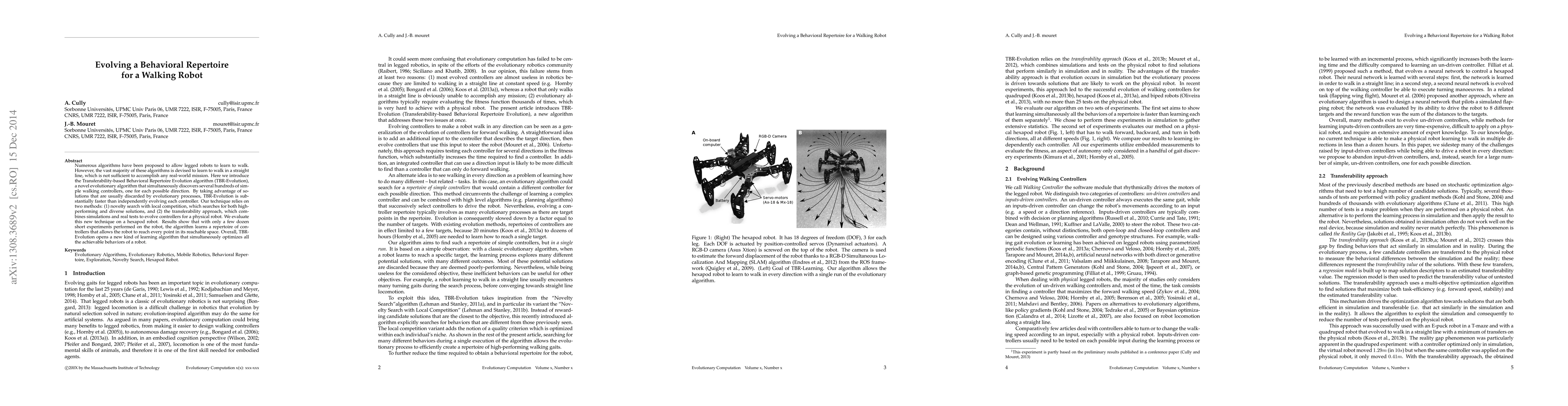 Numerous algorithms have been proposed to allow legged robots to learn to walk. However, the vast majority of these algorithms is devised to learn to walk in a straight line, which is not sufficient to accomplish any real-world mission. Here we introduce the Transferability-based Behavioral Repertoire Evolution algorithm (TBR-Evolution), a novel evolutionary algorithm that simultaneously discovers several hundreds of simple walking controllers, one for each possible direction. By taking advantage of solutions that are usually discarded by evolutionary processes, TBR-Evolution is substantially faster than independently evolving each controller. Our technique relies on two methods: (1) novelty search with local competition, which searches for both high-performing and diverse solutions, and (2) the transferability approach, which com-bines simulations and real tests to evolve controllers for a physical robot. We evaluate this new technique on a hexapod robot. Results show that with only a few dozen short experiments performed on the robot, the algorithm learns a repertoire of con-trollers that allows the robot to reach every point in its reachable space. Overall, TBR-Evolution opens a new kind of learning algorithm that simultaneously optimizes all the achievable behaviors of a robot.