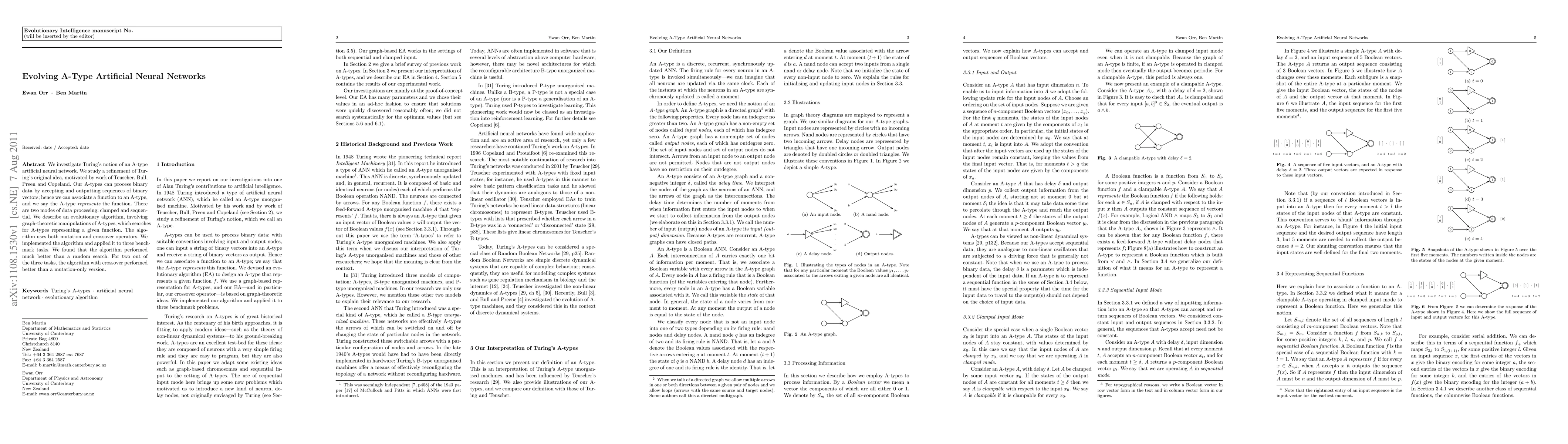 We investigate Turing's notion of an A-type artificial neural network. We study a refinement of Turing's original idea, motivated by work of Teuscher, Bull, Preen and Copeland. Our A-types can process binary data by accepting and outputting sequences of binary vectors; hence we can associate a function to an A-type, and we say the A-type {\em represents} the function. There are two modes of data processing: clamped and sequential. We describe an evolutionary algorithm, involving graph-theoretic manipulations of A-types, which searches for A-types representing a given function. The algorithm uses both mutation and crossover operators. We implemented the algorithm and applied it to three benchmark tasks. We found that the algorithm performed much better than a random search. For two out of the three tasks, the algorithm with crossover performed better than a mutation-only version.