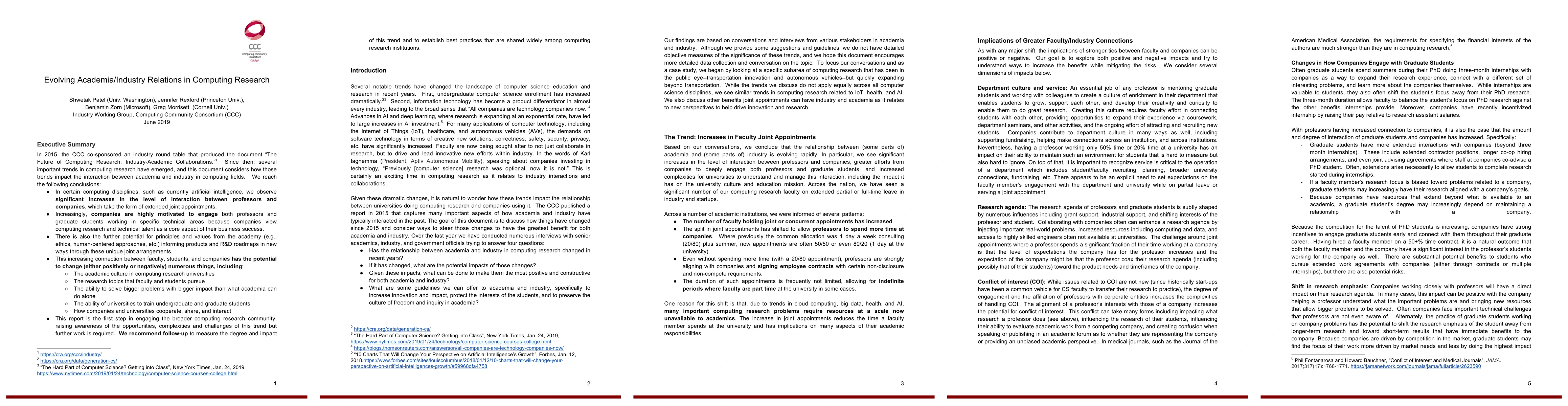 In 2015, the CCC co-sponsored an industry round table that produced the document "The Future of Computing Research: Industry-Academic Collaborations". Since then, several important trends in computing research have emerged, and this document considers how those trends impact the interaction between academia and industry in computing fields. We reach the following conclusions: - In certain computing disciplines, such as currently artificial intelligence, we observe significant increases in the level of interaction between professors and companies, which take the form of extended joint appointments. - Increasingly, companies are highly motivated to engage both professors and graduate students working in specific technical areas because companies view computing research and technical talent as a core aspect of their business success. - There is also the further potential for principles and values from the academy (e.g., ethics, human-centered approaches, etc.) informing products and R&D roadmaps in new ways through these unique joint arrangements. - This increasing connection between faculty, students, and companies has the potential to change (either positively or negatively) numerous things, including: the academic culture in computing research universities, the research topics that faculty and students pursue, the ability of universities to train undergraduate and graduate students, etc. This report is the first step in engaging the broader computing research community, raising awareness of the opportunities, complexities and challenges of this trend but further work is required. We recommend follow-up to measure the degree and impact of this trend and to establish best practices that are shared widely among computing research institutions.