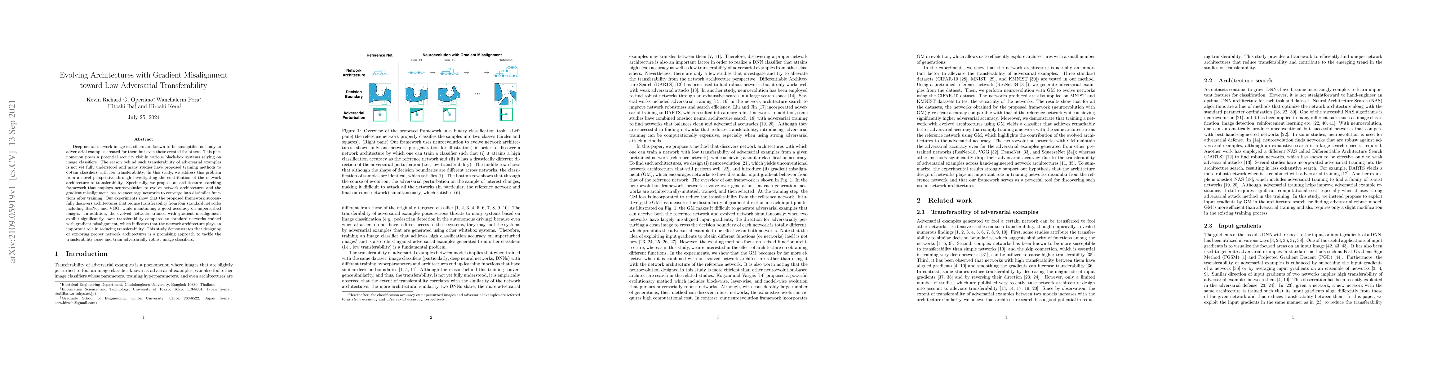 This paper proposes an architecture searching framework using neuroevolution and gradient misalignment loss to evolve neural network architectures that reduce adversarial transferability while maintaining accuracy on clean images. Experiments show that the evolved architectures achieve lower transferability compared to standard networks.