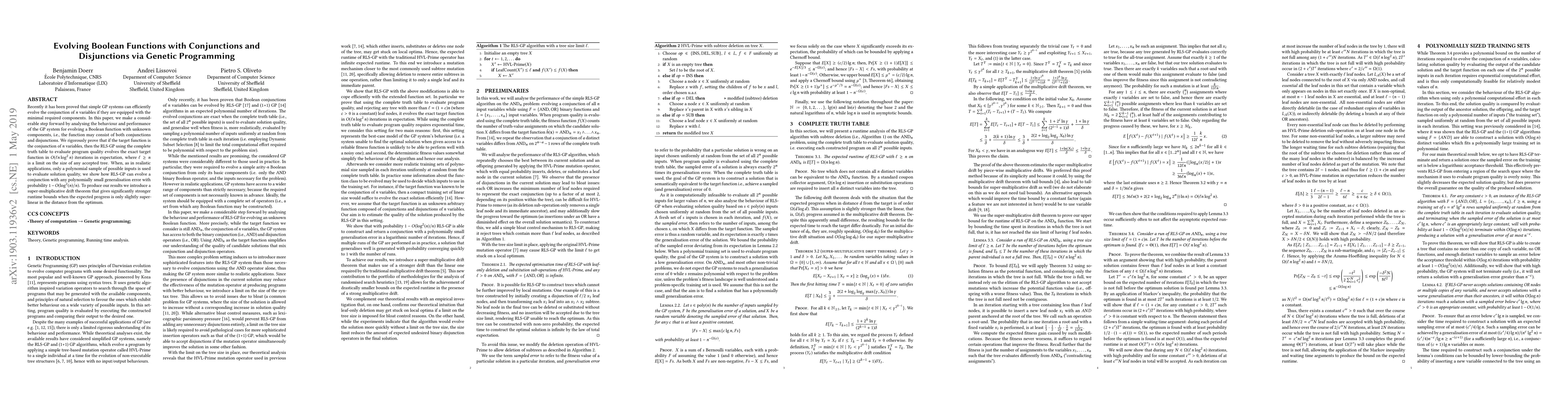 Recently it has been proved that simple GP systems can efficiently evolve the conjunction of $n$ variables if they are equipped with the minimal required components. In this paper, we make a considerable step forward by analysing the behaviour and performance of the GP system for evolving a Boolean function with unknown components, i.e., the function may consist of both conjunctions and disjunctions. We rigorously prove that if the target function is the conjunction of $n$ variables, then the RLS-GP using the complete truth table to evaluate program quality evolves the exact target function in $O(\ell n \log^2 n)$ iterations in expectation, where $\ell \geq n$ is a limit on the size of any accepted tree. When, as in realistic applications, only a polynomial sample of possible inputs is used to evaluate solution quality, we show how RLS-GP can evolve a conjunction with any polynomially small generalisation error with probability $1 - O(\log^2(n)/n)$. To produce our results we introduce a super-multiplicative drift theorem that gives significantly stronger runtime bounds when the expected progress is only slightly super-linear in the distance from the optimum.