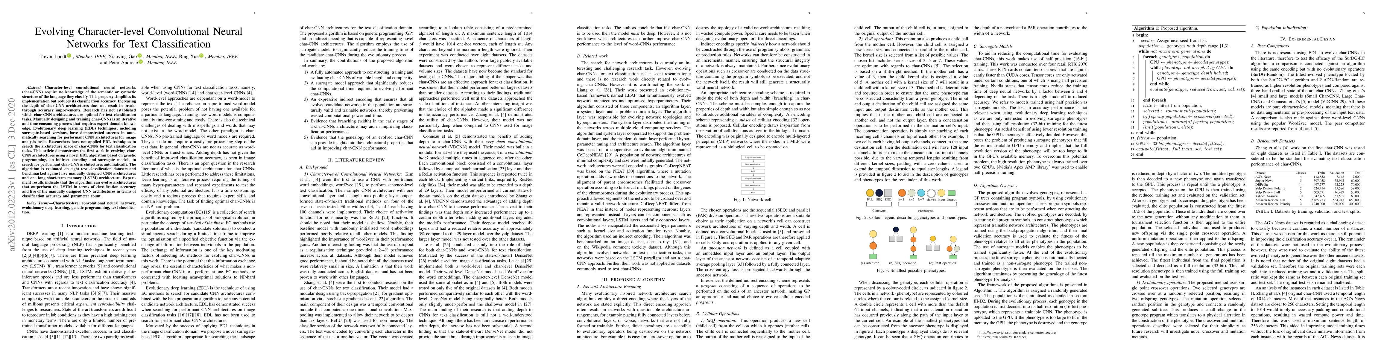 This research introduces an evolutionary deep learning algorithm based on genetic programming to automatically evolve character-level convolutional neural networks (char-CNN) for text classification. The algorithm outperforms traditional manually designed char-CNNs and an LSTM in terms of accuracy and parameter efficiency on multiple datasets.