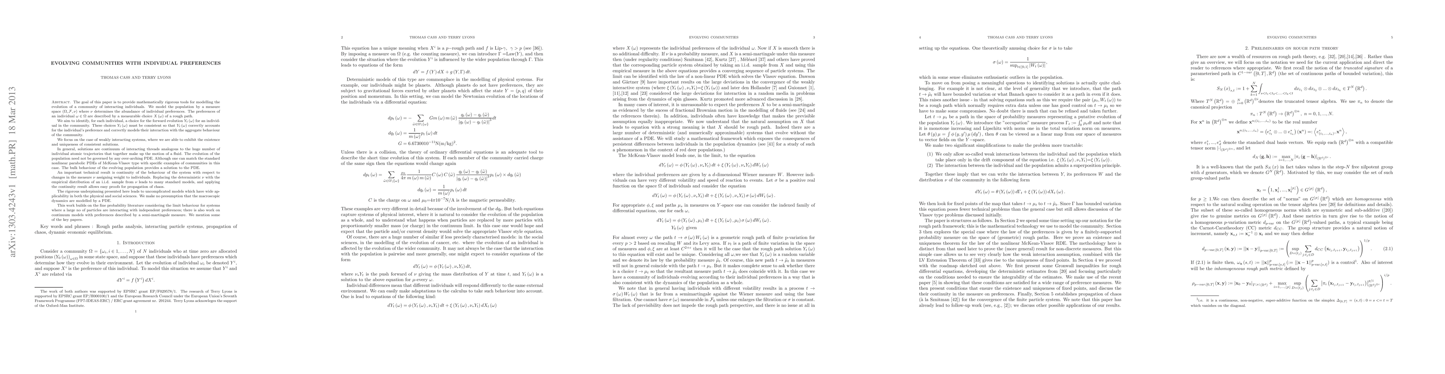 This paper presents rigorous mathematical tools for modeling a community's evolution, considering individual preferences. It introduces a measure space model where preferences are described by rough paths. The study focuses on weakly interacting systems, ensuring existence and uniqueness of consistent solutions. It highlights that population evolution doesn't necessarily follow a PDE, yet specific examples can align with McKean-Vlasov type PDEs. The research emphasizes continuity of system behavior concerning individual weight measures and applies to both physical and social sciences.
