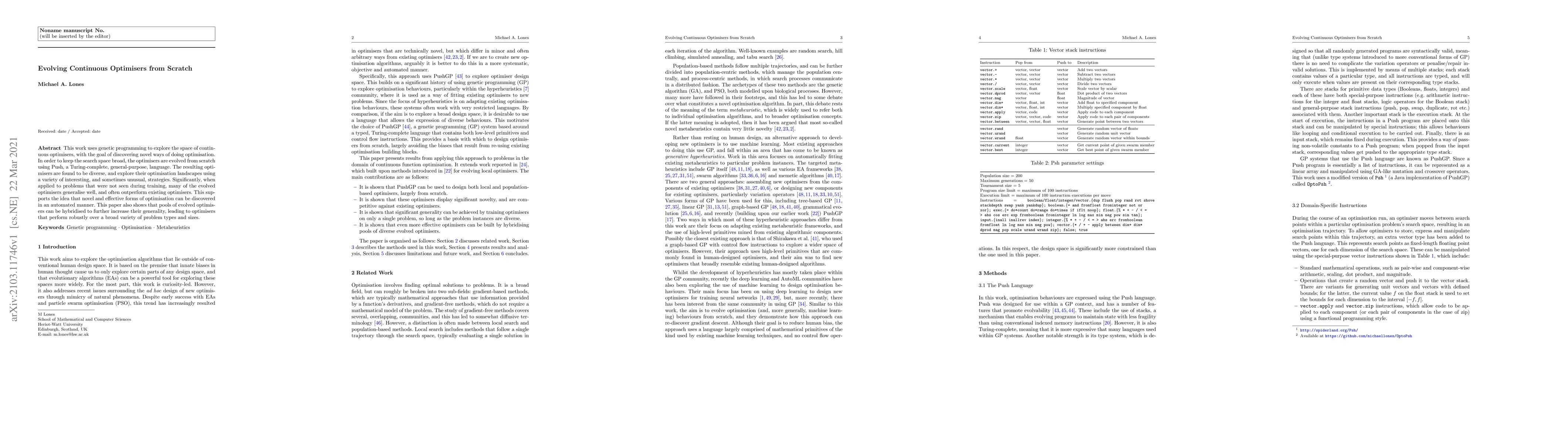 This work uses genetic programming to explore the space of continuous optimisers, with the goal of discovering novel ways of doing optimisation. In order to keep the search space broad, the optimisers are evolved from scratch using Push, a Turing-complete, general-purpose, language. The resulting optimisers are found to be diverse, and explore their optimisation landscapes using a variety of interesting, and sometimes unusual, strategies. Significantly, when applied to problems that were not seen during training, many of the evolved optimisers generalise well, and often outperform existing optimisers. This supports the idea that novel and effective forms of optimisation can be discovered in an automated manner. This paper also shows that pools of evolved optimisers can be hybridised to further increase their generality, leading to optimisers that perform robustly over a broad variety of problem types and sizes.