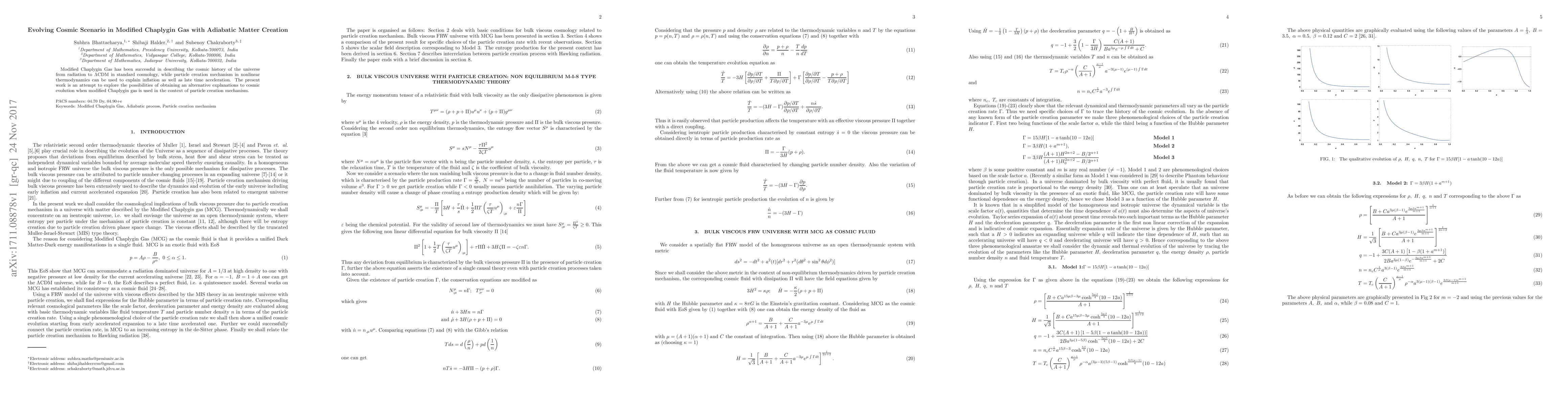 This paper investigates the cosmic evolution using modified Chaplygin gas in conjunction with a particle creation mechanism, aiming to provide alternative explanations for the universe's history from radiation dominance to the $\Lambda$CDM model, including inflation and late-time acceleration.