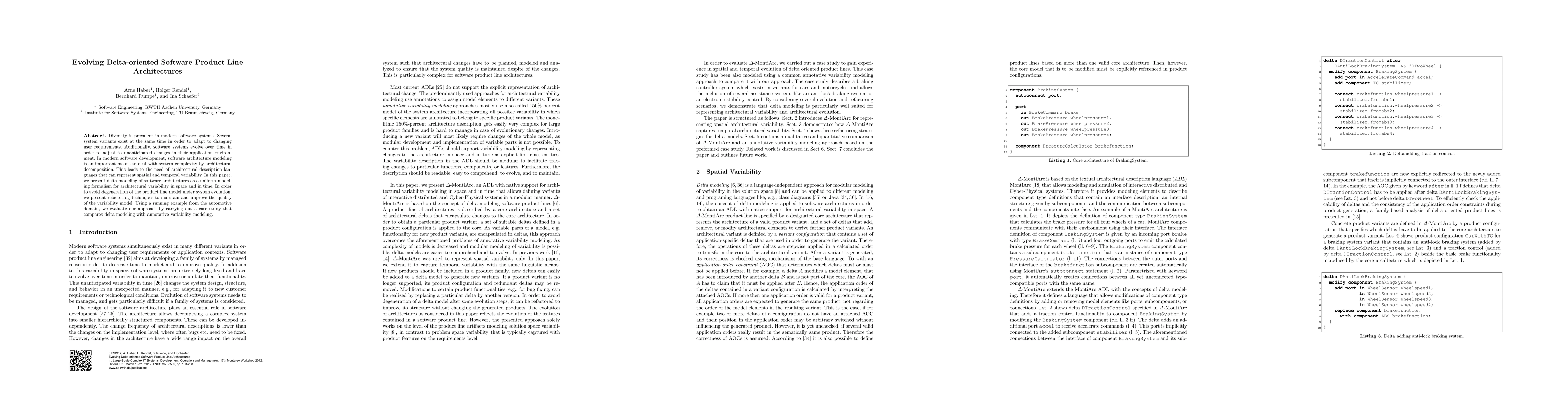 This paper introduces delta modeling for software architecture to manage spatial and temporal variability in evolving product lines. It proposes refactoring techniques to maintain model quality and evaluates the approach through a case study in the automotive domain, comparing it with annotative variability modeling.