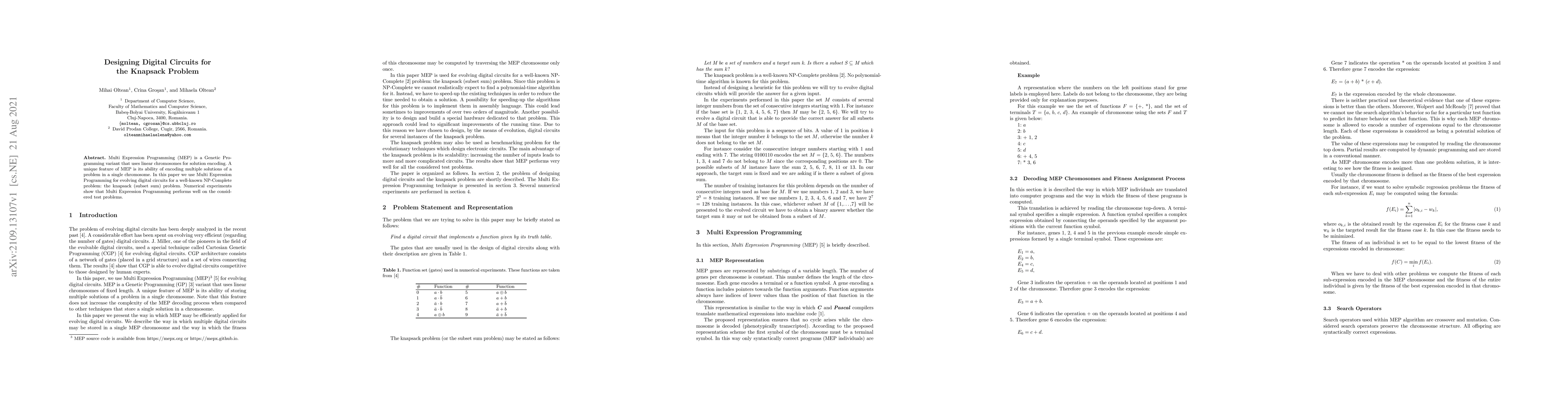 This paper employs Multi Expression Programming (MEP) to evolve digital circuits for solving the knapsack problem, demonstrating MEP's efficacy through numerical experiments on NP-Complete test problems. MEP's ability to encode multiple solutions in a single chromosome enhances its performance.