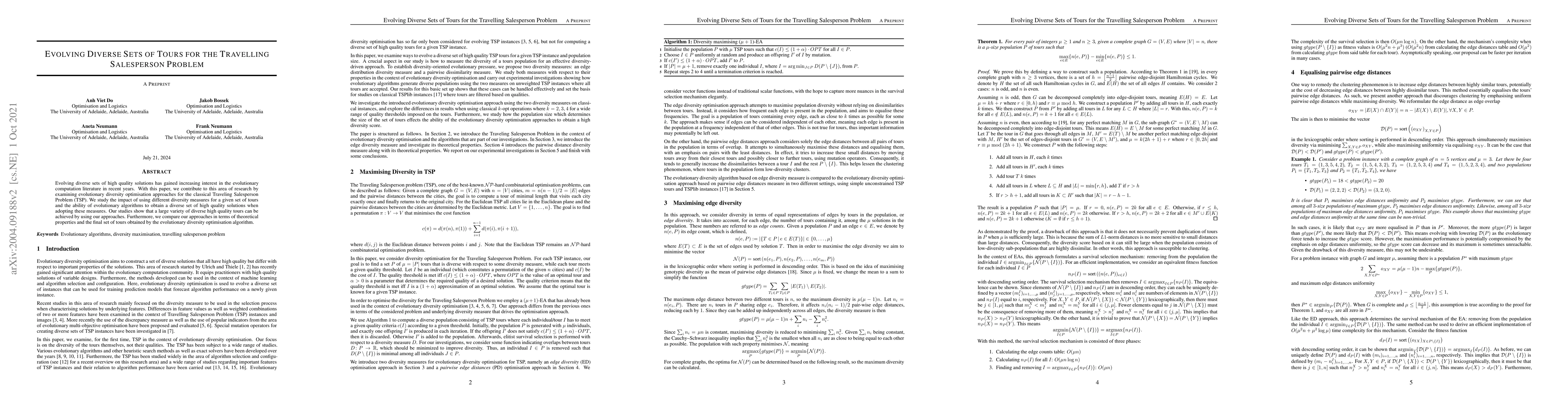 This paper explores evolutionary diversity optimization techniques for the Traveling Salesperson Problem (TSP), demonstrating that various diversity measures can yield a wide range of high-quality, diverse tours. The study compares these approaches based on theoretical properties and the resulting sets of tours.