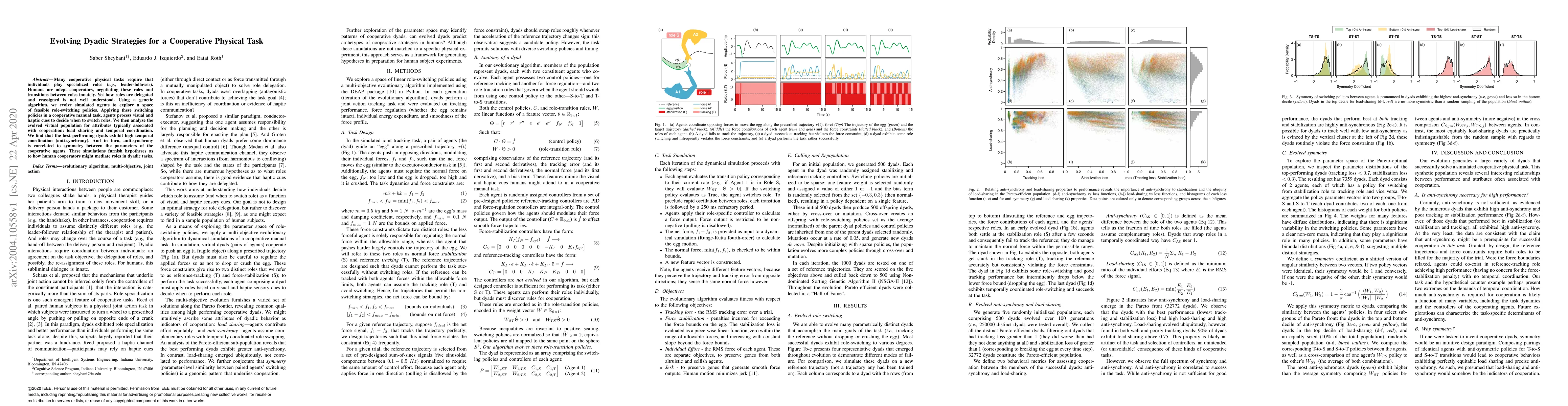 Many cooperative physical tasks require that individuals play specialized roles (e.g., leader-follower). Humans are adept cooperators, negotiating these roles and transitions between roles innately. Yet how roles are delegated and reassigned is not well understood. Using a genetic algorithm, we evolve simulated agents to explore a space of feasible role-switching policies. Applying these switching policies in a cooperative manual task, agents process visual and haptic cues to decide when to switch roles. We then analyze the evolved virtual population for attributes typically associated with cooperation: load sharing and temporal coordination. We find that the best performing dyads exhibit high temporal coordination (anti-synchrony). And in turn, anti-synchrony is correlated to symmetry between the parameters of the cooperative agents. These simulations furnish hypotheses as to how human cooperators might mediate roles in dyadic tasks.