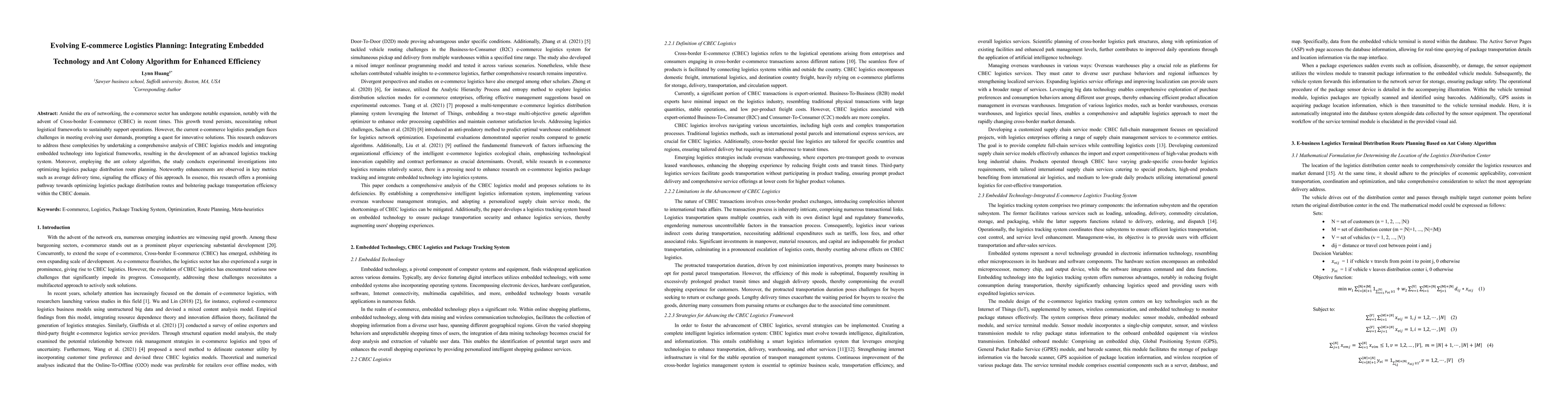 This research explores integrating embedded technology and the ant colony algorithm to optimize logistics planning in Cross-border E-commerce (CBEC), resulting in significant improvements in average delivery times and overall package transportation efficiency. The study demonstrates a promising approach to enhancing e-commerce logistics operations.