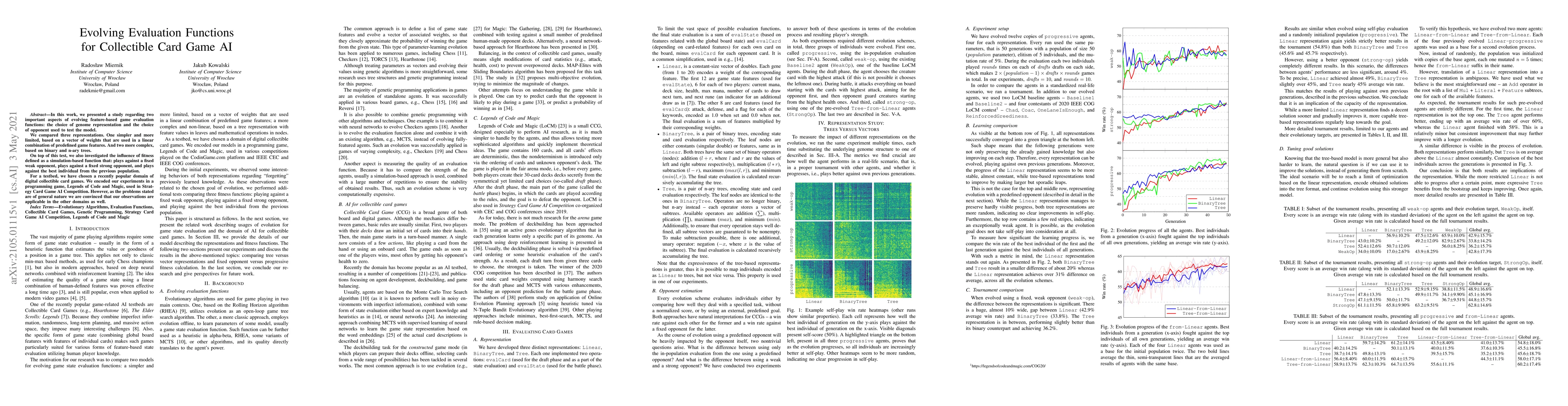 This study explores evolving evaluation functions for AI in collectible card games, comparing three genome representations—linear weights, binary trees, and n-ary trees—and assessing their performance against different opponents. The findings suggest that more complex representations may yield better results, with implications for AI in various game domains.