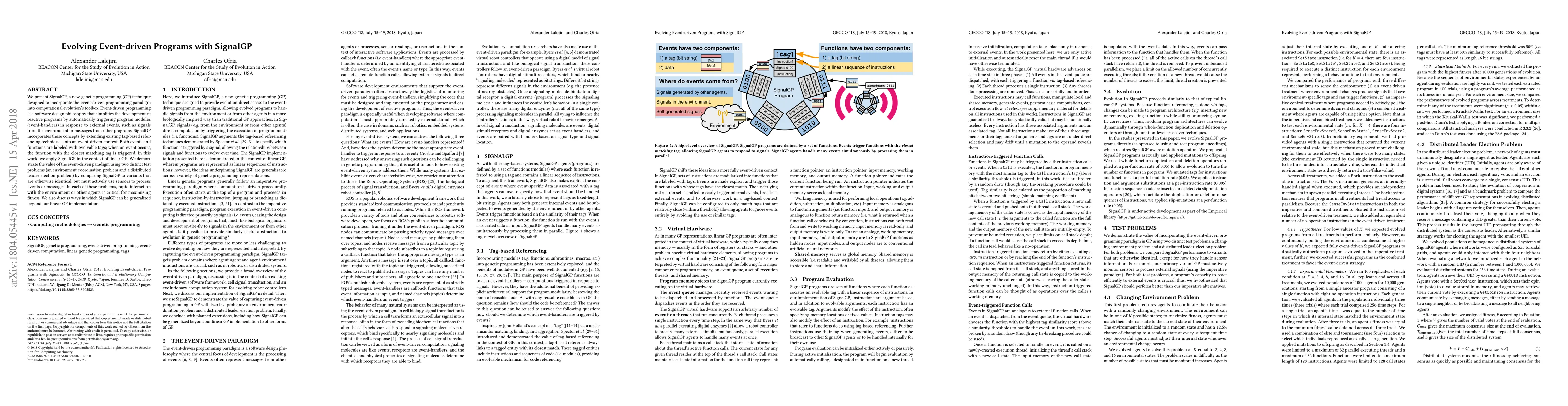 SignalGP introduces a genetic programming technique that integrates event-driven programming, triggering program modules based on evolvable tags, and demonstrates its effectiveness in reactive program development through two test problems. The method shows advantages over traditional approaches that rely on active event processing.