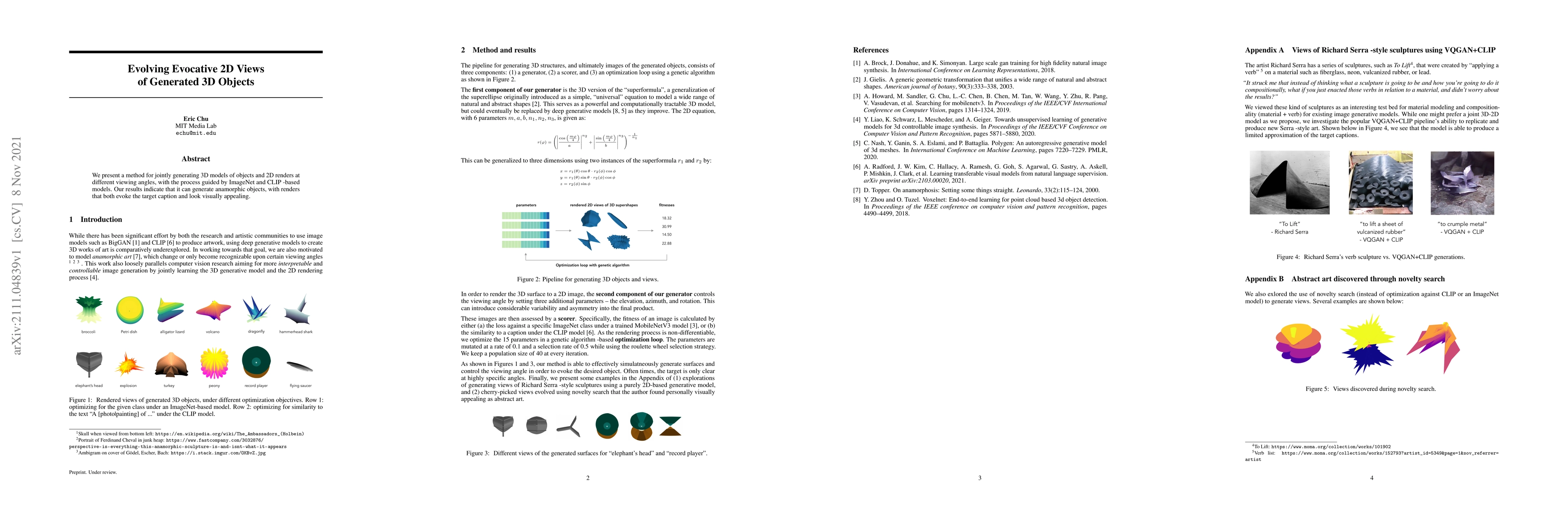 The paper introduces a method that simultaneously creates 3D models of objects and their 2D views from various angles, using ImageNet and CLIP models for guidance. The results show the generation of visually pleasing and anamorphic objects that visually embody the given caption.
