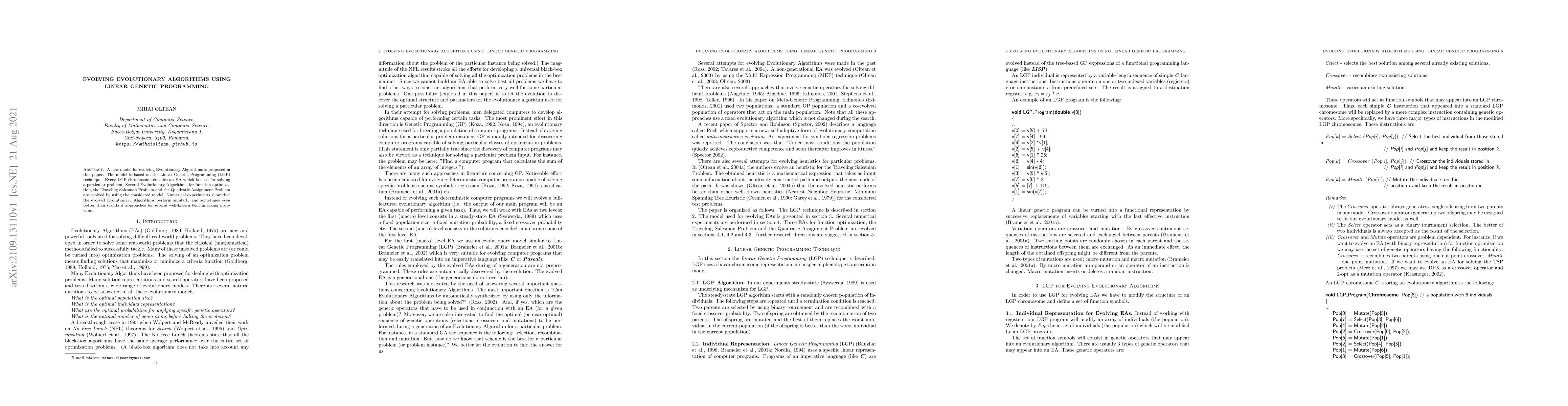 This paper introduces a novel model for evolving Evolutionary Algorithms using Linear Genetic Programming (LGP), demonstrating improved or comparable performance to standard methods in optimization problems like the Traveling Salesman and Quadratic Assignment Problems.