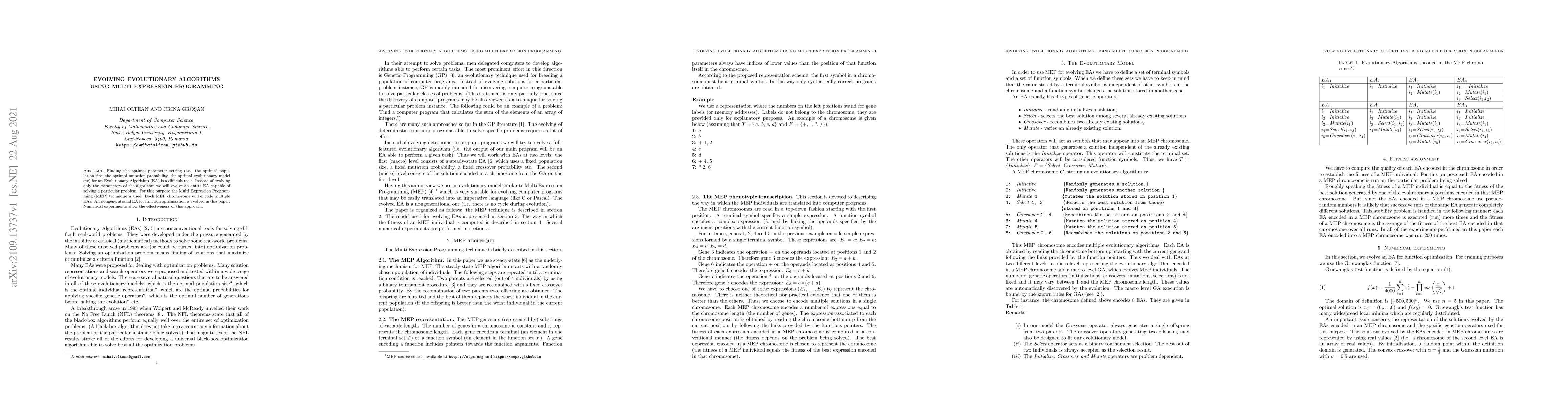This paper proposes evolving entire Evolutionary Algorithms using Multi Expression Programming (MEP) to solve specific optimization problems, rather than tuning parameters. MEP encodes multiple EAs in each chromosome, leading to the evolution of a nongenerational EA, which is shown to be effective through numerical experiments.