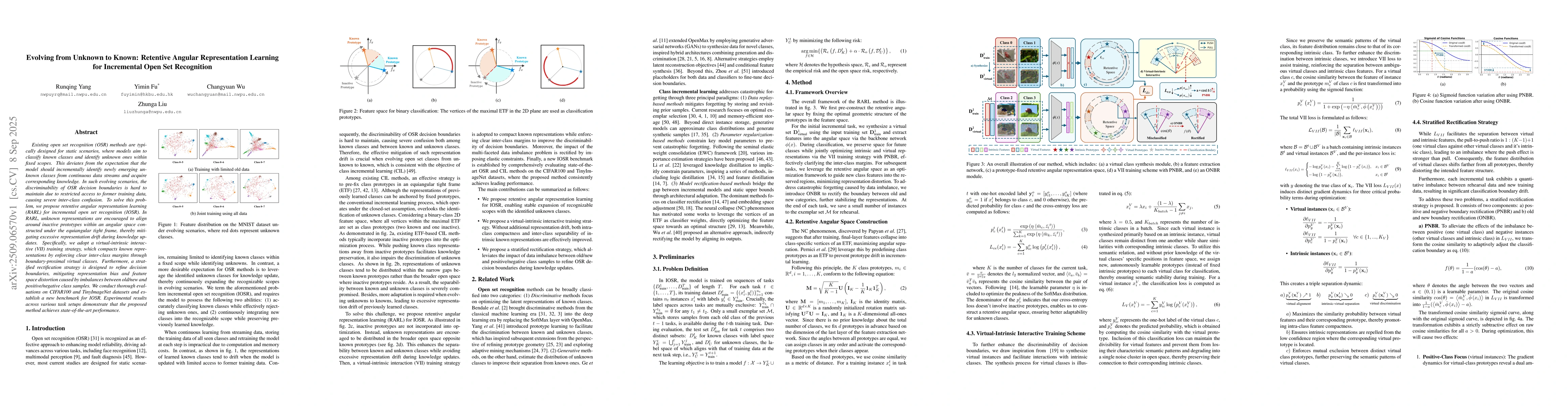 Existing open set recognition (OSR) methods are typically designed for static scenarios, where models aim to classify known classes and identify unknown ones within fixed scopes. This deviates from the expectation that the model should incrementally identify newly emerging unknown classes from continuous data streams and acquire corresponding knowledge. In such evolving scenarios, the discriminability of OSR decision boundaries is hard to maintain due to restricted access to former training data, causing severe inter-class confusion. To solve this problem, we propose retentive angular representation learning (RARL) for incremental open set recognition (IOSR). In RARL, unknown representations are encouraged to align around inactive prototypes within an angular space constructed under the equiangular tight frame, thereby mitigating excessive representation drift during knowledge updates. Specifically, we adopt a virtual-intrinsic interactive (VII) training strategy, which compacts known representations by enforcing clear inter-class margins through boundary-proximal virtual classes. Furthermore, a stratified rectification strategy is designed to refine decision boundaries, mitigating representation bias and feature space distortion caused by imbalances between old/new and positive/negative class samples. We conduct thorough evaluations on CIFAR100 and TinyImageNet datasets and establish a new benchmark for IOSR. Experimental results across various task setups demonstrate that the proposed method achieves state-of-the-art performance.