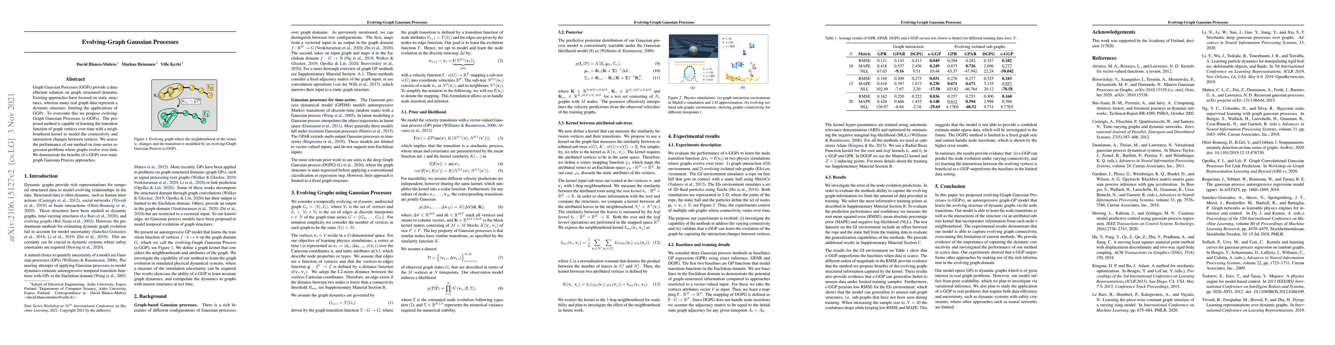 The paper proposes evolving-Graph Gaussian Processes (e-GGPs) to model dynamic graph structures over time, utilizing a neighborhood kernel to capture changes in connectivity and interactions. The method outperforms static graph Gaussian Process approaches in time-series regression tasks involving evolving graphs.