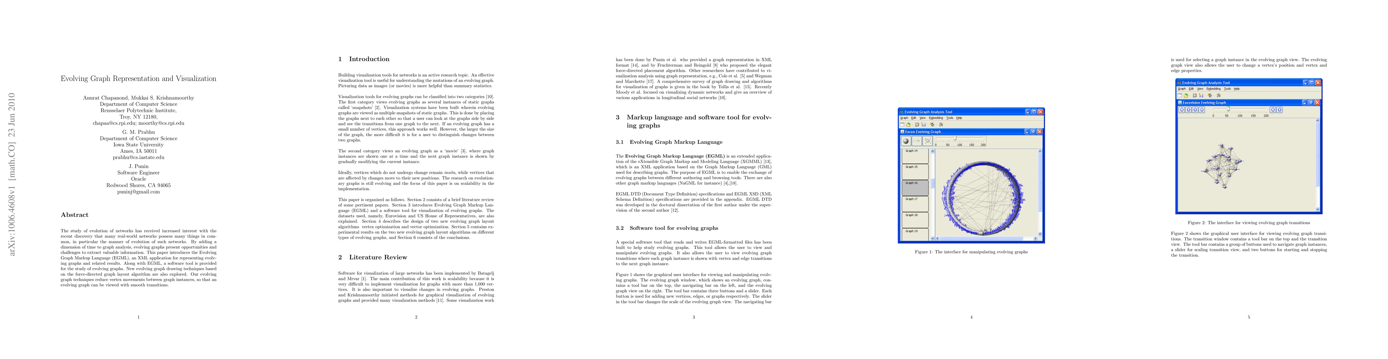 This paper introduces the Evolving Graph Markup Language (EGML) for representing evolving graphs and provides a software tool for their study. It also explores new graph visualization techniques based on force-directed layout to minimize vertex movement, enabling smooth transitions in evolving graph visualizations.