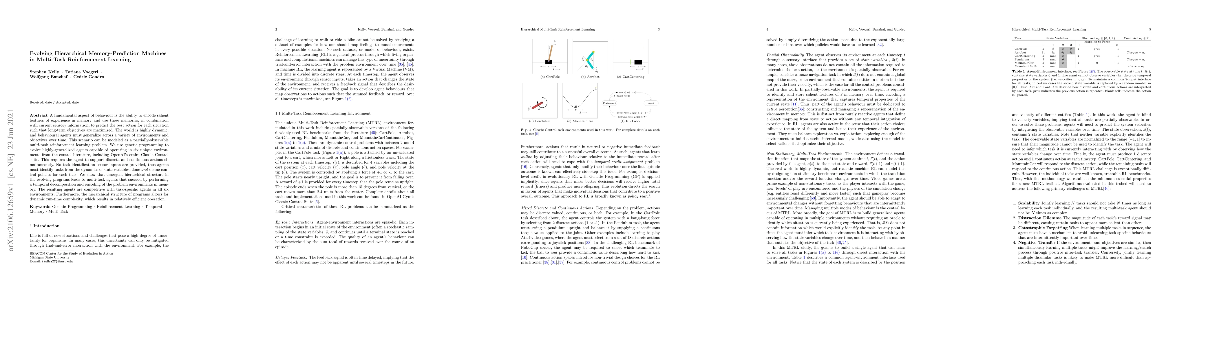 A fundamental aspect of behaviour is the ability to encode salient features of experience in memory and use these memories, in combination with current sensory information, to predict the best action for each situation such that long-term objectives are maximized. The world is highly dynamic, and behavioural agents must generalize across a variety of environments and objectives over time. This scenario can be modeled as a partially-observable multi-task reinforcement learning problem. We use genetic programming to evolve highly-generalized agents capable of operating in six unique environments from the control literature, including OpenAI's entire Classic Control suite. This requires the agent to support discrete and continuous actions simultaneously. No task-identification sensor inputs are provided, thus agents must identify tasks from the dynamics of state variables alone and define control policies for each task. We show that emergent hierarchical structure in the evolving programs leads to multi-task agents that succeed by performing a temporal decomposition and encoding of the problem environments in memory. The resulting agents are competitive with task-specific agents in all six environments. Furthermore, the hierarchical structure of programs allows for dynamic run-time complexity, which results in relatively efficient operation.