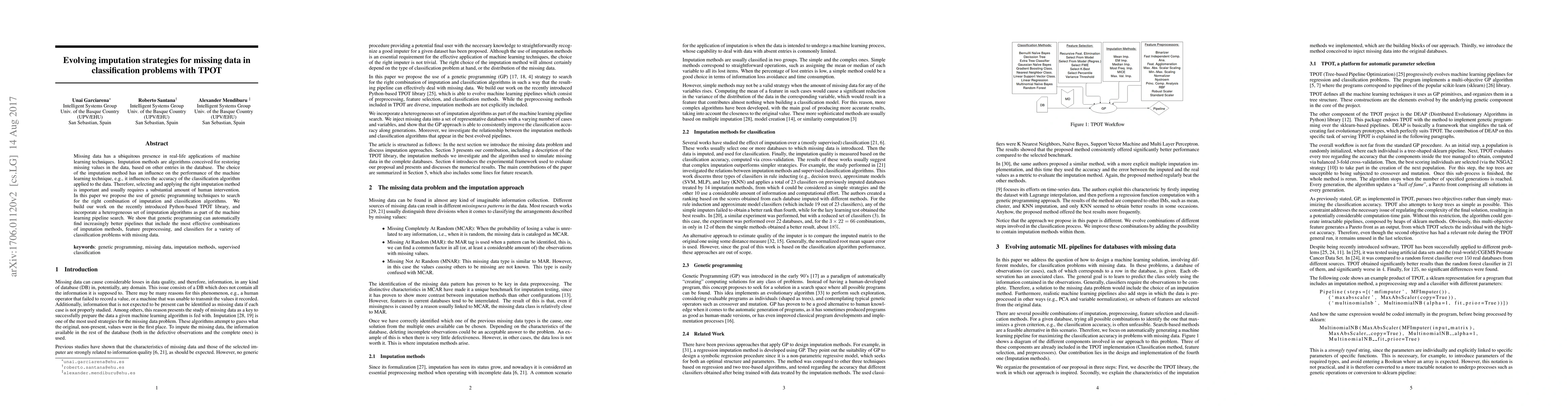 This paper proposes using genetic programming with the TPOT library to automatically select optimal imputation and classification algorithms for datasets with missing data, demonstrating improved performance over traditional methods that require significant human intervention.