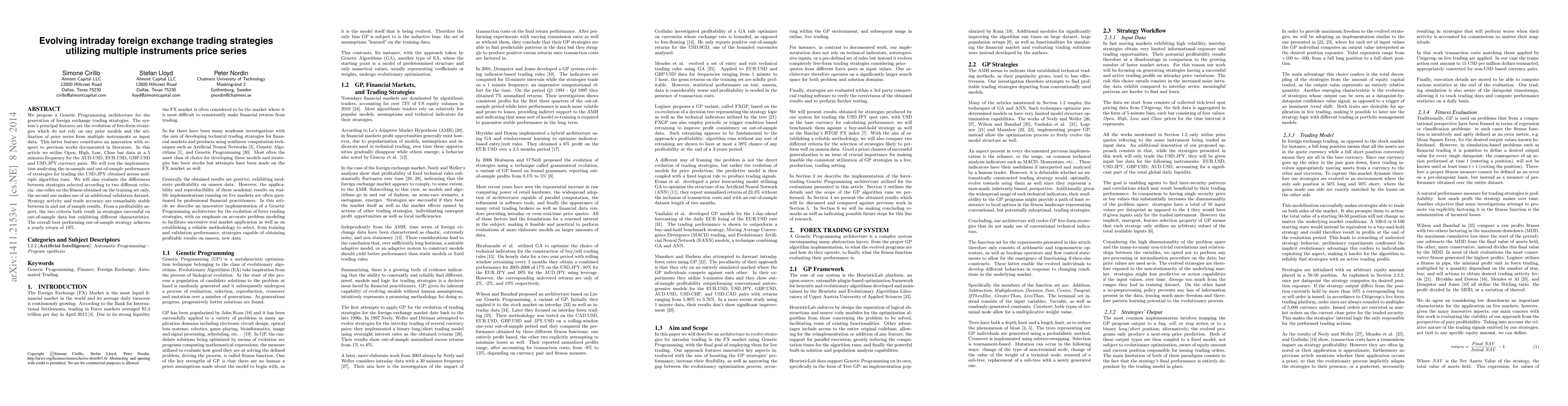 This paper proposes a Genetic Programming system to evolve intraday foreign exchange trading strategies using price series from multiple instruments. The strategies show stable performance and profitability, with the best-performing strategy achieving a yearly return of 19%.