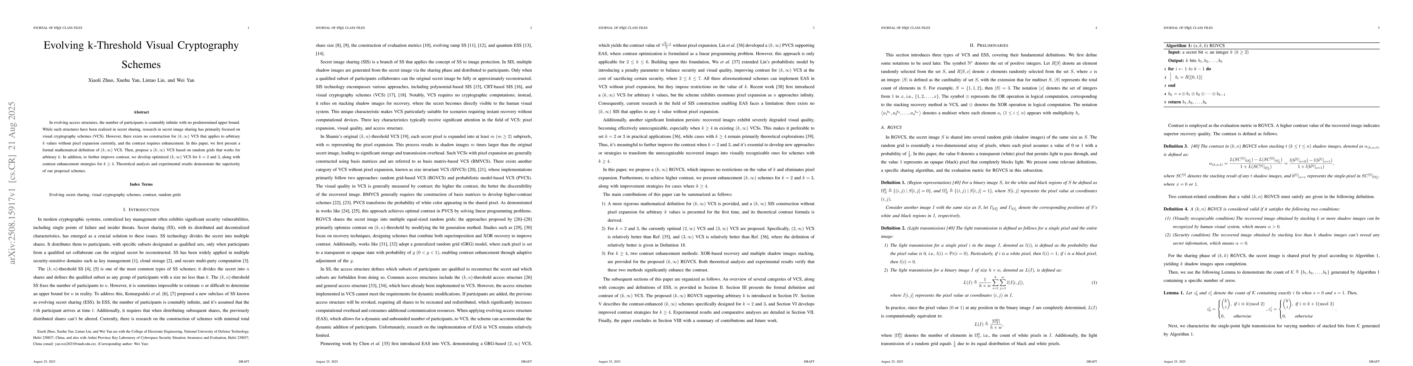 In evolving access structures, the number of participants is countably infinite with no predetermined upper bound. While such structures have been realized in secret sharing, research in secret image sharing has primarily focused on visual cryptography schemes (VCS). However, there exists no construction for $(k,\infty)$ VCS that applies to arbitrary $k$ values without pixel expansion currently, and the contrast requires enhancement. In this paper, we first present a formal mathematical definition of $(k,\infty)$ VCS. Then, propose a $(k,\infty)$ VCS based on random grids that works for arbitrary $k$. In addition, to further improve contrast, we develop optimized $(k,\infty)$ VCS for $k=2$ and $3$, along with contrast enhancement strategies for $k\geq 4$. Theoretical analysis and experimental results demonstrate the superiority of our proposed schemes.