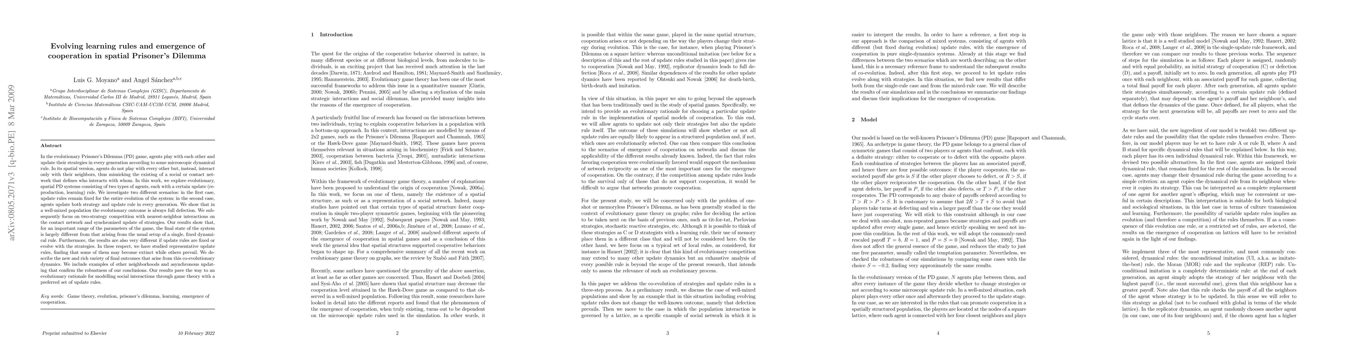 This research investigates the Prisoner's Dilemma game in a spatial context with evolving learning rules among agents. The study reveals that in well-mixed populations, defection is always the outcome. However, with nearest-neighbor interactions and synchronized strategy updates, various final states emerge depending on fixed or evolving update rules. The findings suggest a diverse range of outcomes, paving the way for modeling social interactions with preferred update rules.