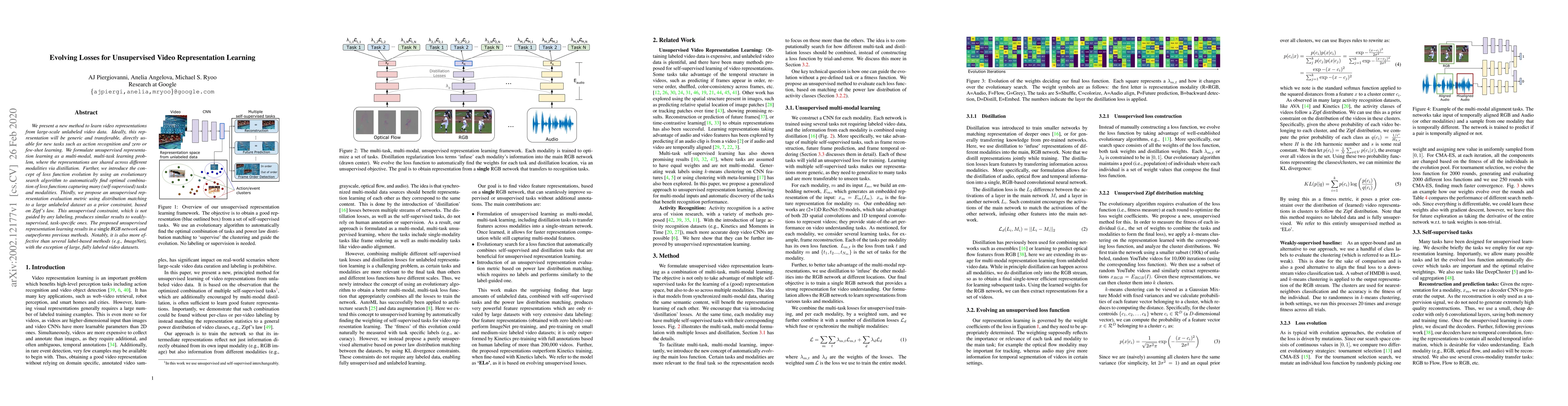 This paper introduces a method for learning video representations from unlabeled data, employing multi-modal, multi-task learning and loss function evolution via an evolutionary search algorithm. The approach results in a single RGB network that outperforms previous unsupervised methods and is comparable to some label-based methods, except for those trained on large, fully labeled datasets.