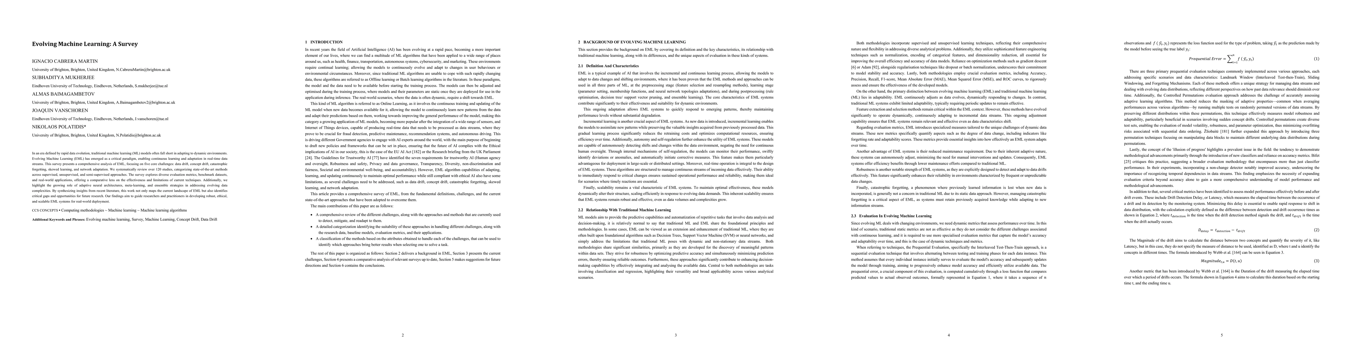 Evolving Machine Learning (EML) enables continuous learning in dynamic environments, addressing challenges like data drift and concept drift. This survey analyzes 120+ studies to provide a comprehensive understanding of EML techniques and highlight areas for future research and development.