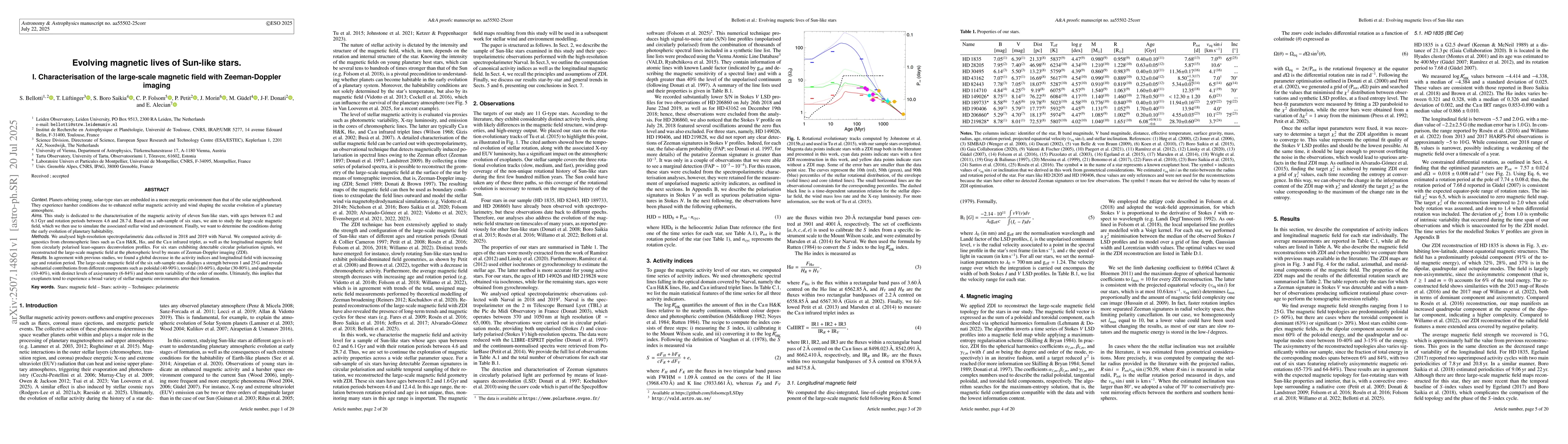 Planets orbiting young, solar-type stars are embedded in a more energetic environment than that of the solar neighbourhood. They experience harsher conditions due to enhanced stellar magnetic activity and wind shaping the secular evolution of a planetary atmosphere. This study is dedicated to the characterisation of the magnetic activity of eleven Sun-like stars, with ages between 0.2 and 6.1 Gyr and rotation periods between 4.6 and 28.7 d. Based on a sub-sample of six stars, we aim to study the large-scale magnetic field, which we then use to simulate the associated stellar wind and environment. Finally, we want to determine the conditions during the early evolution of planetary habitability. We analysed high-resolution spectropolarimetric data collected in 2018 and 2019 with Narval. We computed activity diagnostics from chromospheric lines such as CaII H&K, H$\alpha$, and the CaII infrared triplet, as well as the longitudinal magnetic field from circularly polarised least-squares deconvolution profiles. For six stars exhibiting detectable circular polarisation signals, we reconstructed the large-scale magnetic field at the photospheric level by means of Zeeman-Doppler imaging (ZDI). In agreement with previous studies, we found a global decrease in the activity indices and longitudinal field with increasing age and rotation period. The large-scale magnetic field of the six sub-sample stars displays a strength between 1 and 25 G and reveals substantial contributions from different components such as poloidal (40-90 %), toroidal (10-60 %), dipolar (30-80 %), and quadrupolar (10-40 %), with distinct levels of axisymmetry (6-84 %) and short-term variability of the order of months. Ultimately, this implies that exoplanets tend to experience a broad variety of stellar magnetic environments after their formation.