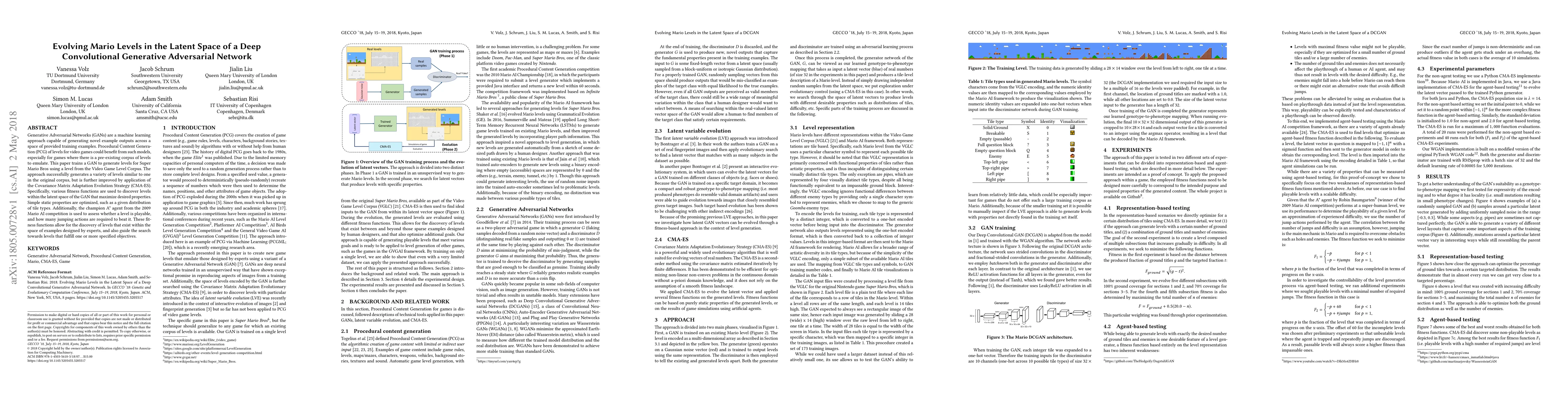 This paper trains a GAN to procedurally generate Super Mario Bros levels, leveraging the latent space to optimize for specific properties like tile type distribution and playability. The use of CMA-ES and a champion Mario AI agent enhances the quality and objectives of the generated levels.