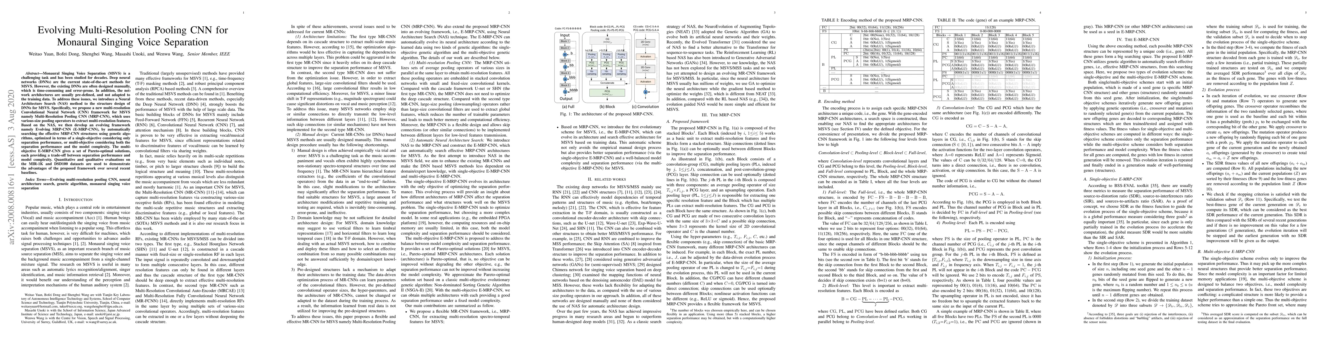 This paper proposes an Evolving Multi-Resolution Pooling CNN (E-MRP-CNN) framework for Monaural Singing Voice Separation, utilizing Neural Architecture Search to automatically optimize network structures. The approach extracts multi-resolution features using various-size pooling and provides a set of Pareto-optimal solutions balancing separation performance and model complexity.
