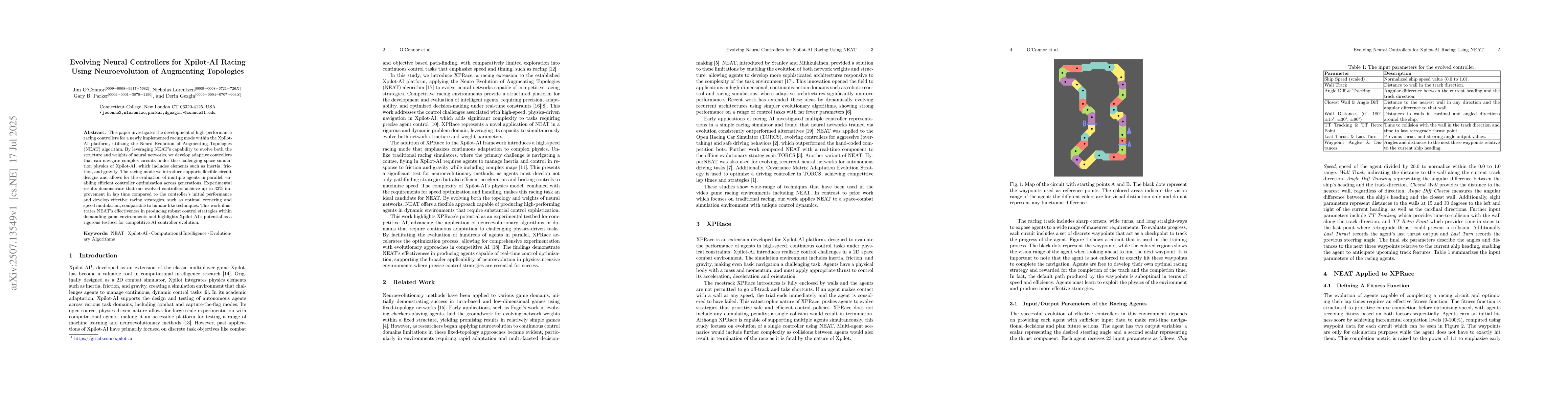 This paper investigates the development of high-performance racing controllers for a newly implemented racing mode within the Xpilot-AI platform, utilizing the Neuro Evolution of Augmenting Topologies (NEAT) algorithm. By leveraging NEAT's capability to evolve both the structure and weights of neural networks, we develop adaptive controllers that can navigate complex circuits under the challenging space simulation physics of Xpilot-AI, which includes elements such as inertia, friction, and gravity. The racing mode we introduce supports flexible circuit designs and allows for the evaluation of multiple agents in parallel, enabling efficient controller optimization across generations. Experimental results demonstrate that our evolved controllers achieve up to 32% improvement in lap time compared to the controller's initial performance and develop effective racing strategies, such as optimal cornering and speed modulation, comparable to human-like techniques. This work illustrates NEAT's effectiveness in producing robust control strategies within demanding game environments and highlights Xpilot-AI's potential as a rigorous testbed for competitive AI controller evolution.