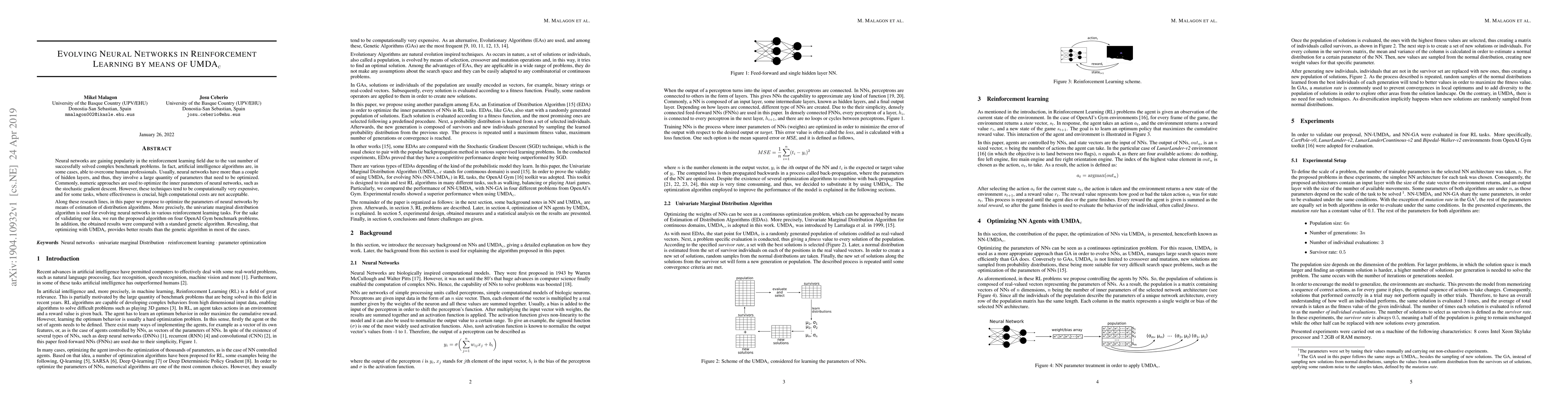 This paper proposes using the Univariate Marginal Distribution Algorithm (UMDAc) to optimize neural networks for reinforcement learning, achieving better results than standard genetic algorithms on four OpenAI Gym benchmark problems, demonstrating reduced computational costs and improved effectiveness.