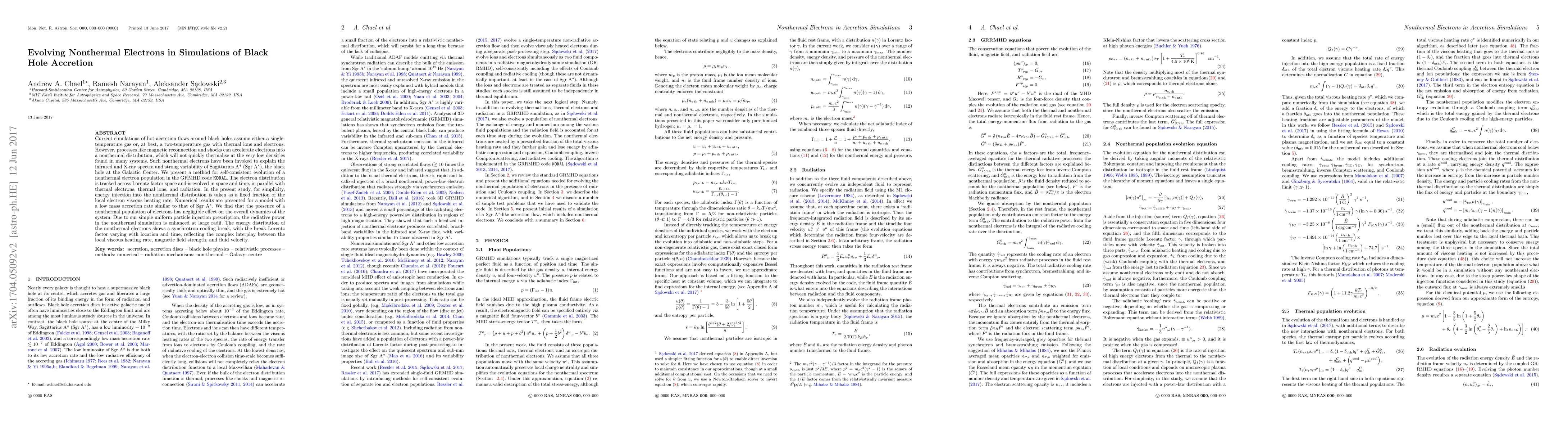 Current simulations of hot accretion flows around black holes assume either a single-temperature gas or, at best, a two-temperature gas with thermal ions and electrons. However, processes like magnetic reconnection and shocks can accelerate electrons into a nonthermal distribution, which will not quickly thermalise at the very low densities found in many systems. Such nonthermal electrons have been invoked to explain the infrared and X-ray spectra and strong variability of Sagittarius A* (Sgr A*), the black hole at the Galactic Center. We present a method for self-consistent evolution of a nonthermal electron population in the GRMHD code KORAL. The electron distribution is tracked across Lorentz factor space and is evolved in space and time, in parallel with thermal electrons, thermal ions, and radiation. In the present study, for simplicity, energy injection into the nonthermal distribution is taken as a fixed fraction of the local electron viscous heating rate. Numerical results are presented for a model with a low mass accretion rate similar to that of Sgr A*. We find that the presence of a nonthermal population of electrons has negligible effect on the overall dynamics of the system. Due to our simple uniform particle injection prescription, the radiative power in the nonthermal simulation is enhanced at large radii. The energy distribution of the nonthermal electrons shows a synchrotron cooling break, with the break Lorentz factor varying with location and time, reflecting the complex interplay between the local viscous heating rate, magnetic field strength, and fluid velocity.