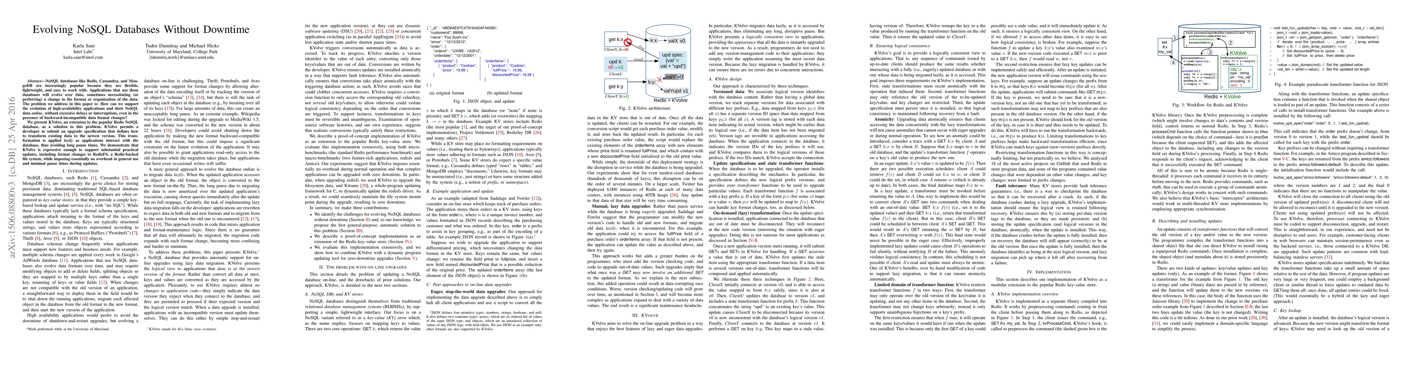 This paper introduces KVolve, an extension to the Redis NoSQL database, designed to enable seamless evolution of data formats without downtime. It allows developers to specify transformations for data updates, applying them lazily during normal database operations, thereby minimizing interruptions and overhead.