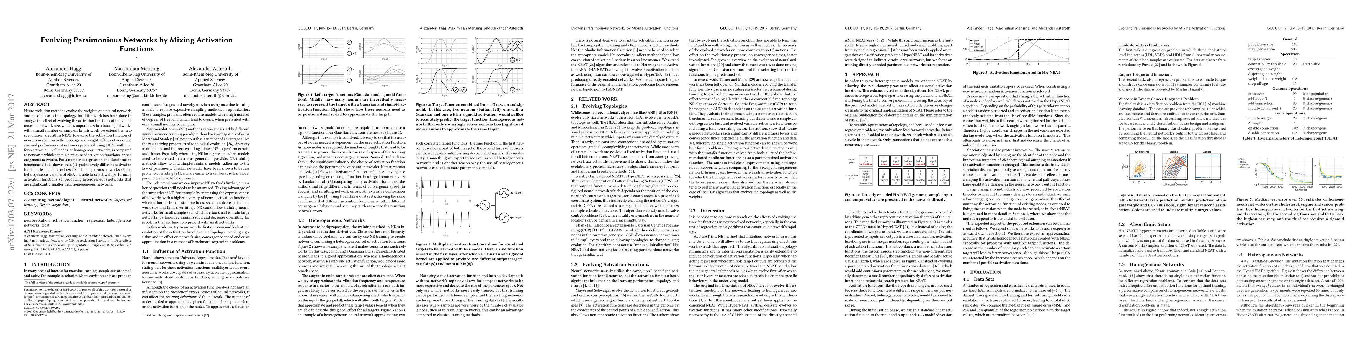 Neuroevolution methods evolve the weights of a neural network, and in some cases the topology, but little work has been done to analyze the effect of evolving the activation functions of individual nodes on network size, which is important when training networks with a small number of samples. In this work we extend the neuroevolution algorithm NEAT to evolve the activation function of neurons in addition to the topology and weights of the network. The size and performance of networks produced using NEAT with uniform activation in all nodes, or homogenous networks, is compared to networks which contain a mixture of activation functions, or heterogenous networks. For a number of regression and classification benchmarks it is shown that, (1) qualitatively different activation functions lead to different results in homogeneous networks, (2) the heterogeneous version of NEAT is able to select well performing activation functions, (3) producing heterogeneous networks that are significantly smaller than homogeneous networks.
