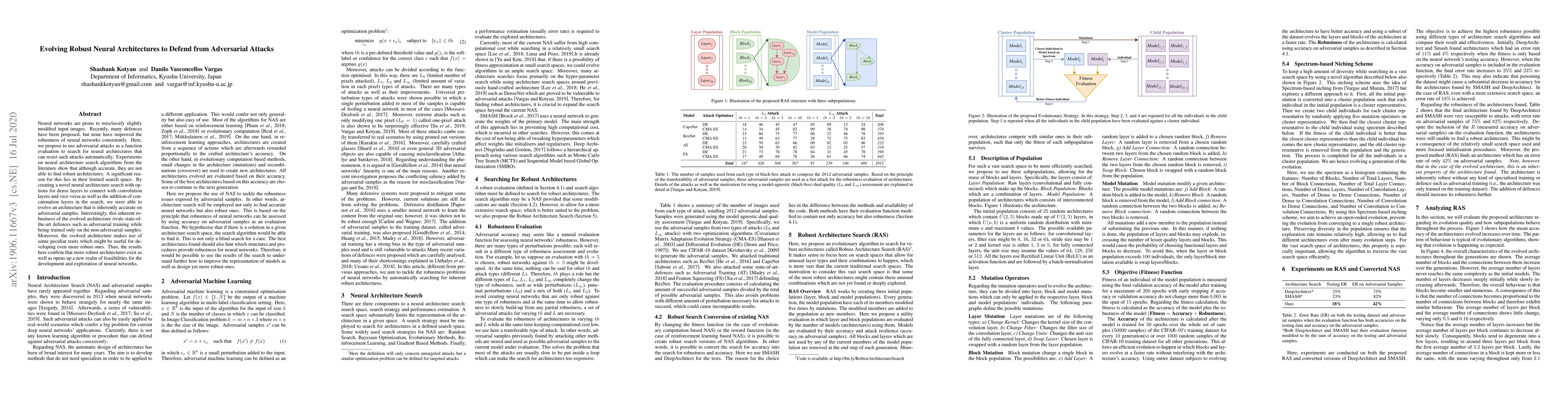 This paper proposes a novel neural architecture search method to evolve robust neural networks against adversarial attacks, demonstrating that by expanding the search space to include dense and convolutional layers, a more inherently robust architecture can be found that rivals state-of-the-art defenses without requiring adversarial training.