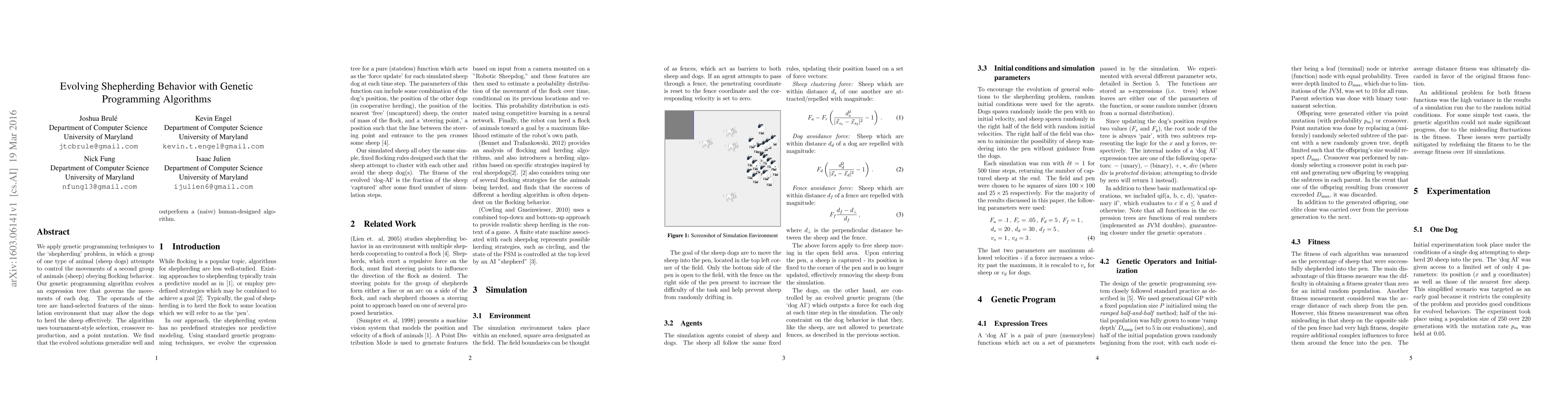 This paper uses genetic programming to evolve algorithms for shepherding dogs to control sheep in a simulation, finding that the evolved solutions generalize well and outperform a naive human-designed algorithm. The algorithm employs tournament selection, crossover, and mutation to develop an expression tree that governs dog movements based on hand-selected features.