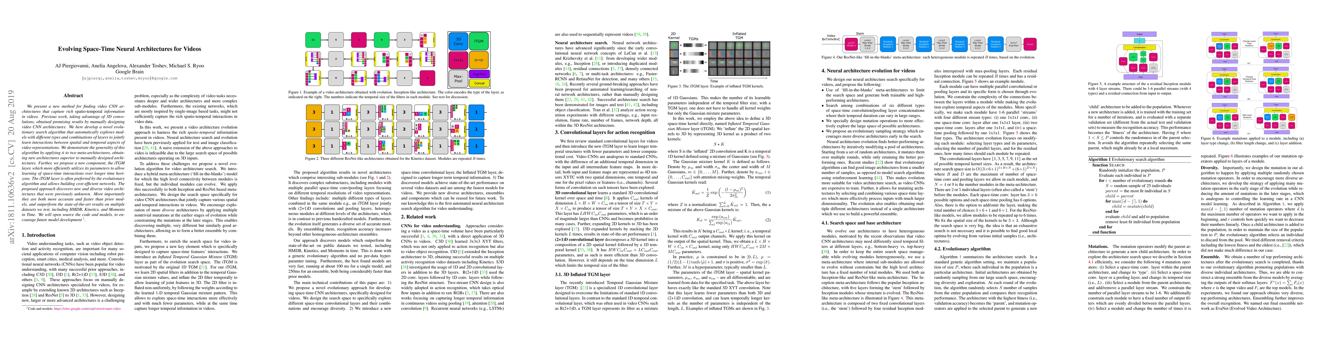 We present a new method for finding video CNN architectures that capture rich spatio-temporal information in videos. Previous work, taking advantage of 3D convolutions, obtained promising results by manually designing video CNN architectures. We here develop a novel evolutionary search algorithm that automatically explores models with different types and combinations of layers to jointly learn interactions between spatial and temporal aspects of video representations. We demonstrate the generality of this algorithm by applying it to two meta-architectures, obtaining new architectures superior to manually designed architectures. Further, we propose a new component, the iTGM layer, which more efficiently utilizes its parameters to allow learning of space-time interactions over longer time horizons. The iTGM layer is often preferred by the evolutionary algorithm and allows building cost-efficient networks. The proposed approach discovers new and diverse video architectures that were previously unknown. More importantly they are both more accurate and faster than prior models, and outperform the state-of-the-art results on multiple datasets we test, including HMDB, Kinetics, and Moments in Time. We will open source the code and models, to encourage future model development.